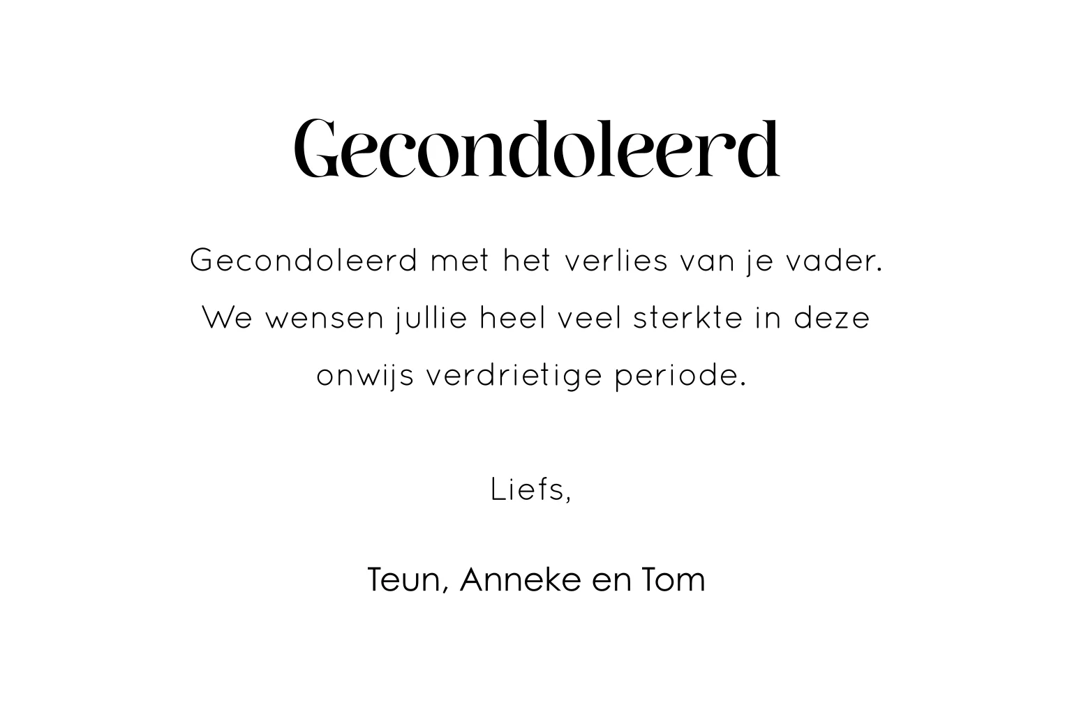 Stuur een mooie condoleancekaart met persoonlijke tekst om iemand sterkte te wensen in een tijd van rouw.