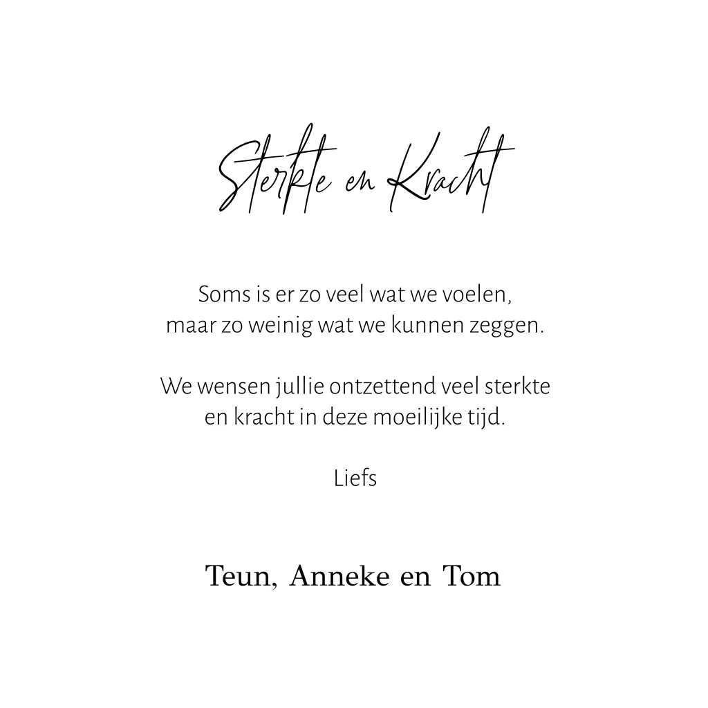 Stuur een mooie condoleancekaart met persoonlijke tekst om iemand sterkte te wensen in een tijd van rouw.