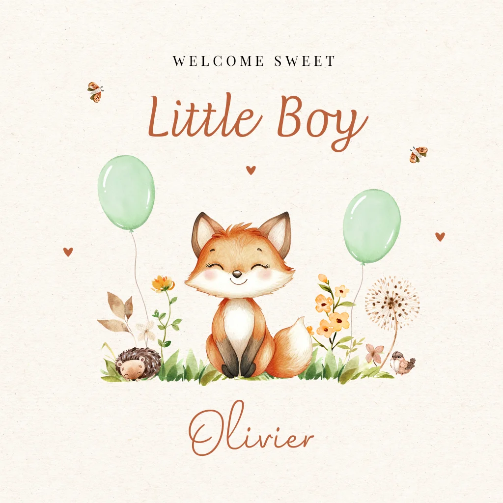 Felicitatie kaart geboorte zoon baby jongen dieren vosje ballonnen