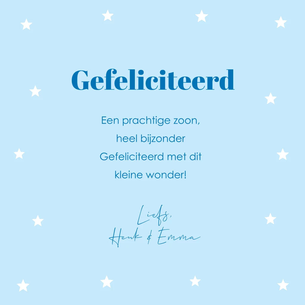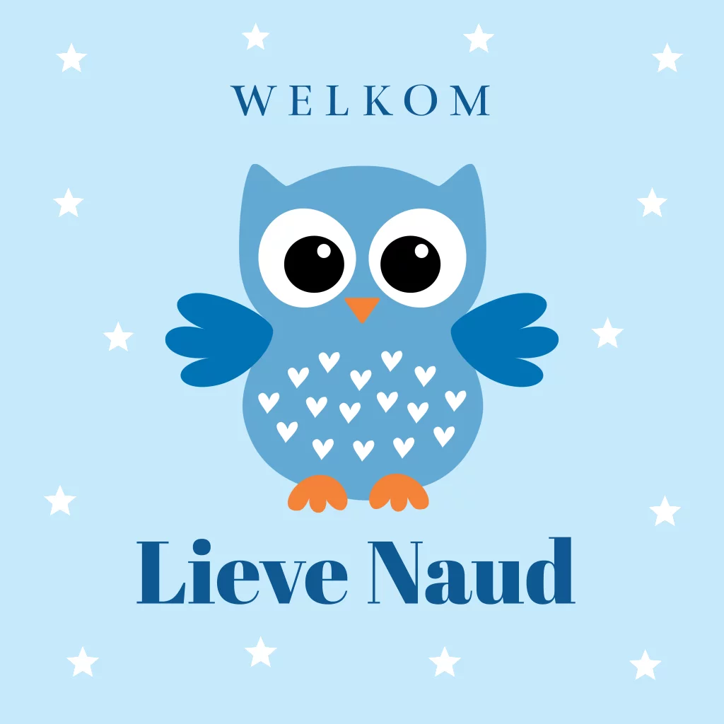 Felicitatie kaart geboorte zoon baby jongen met uiltje blauw en sterren.