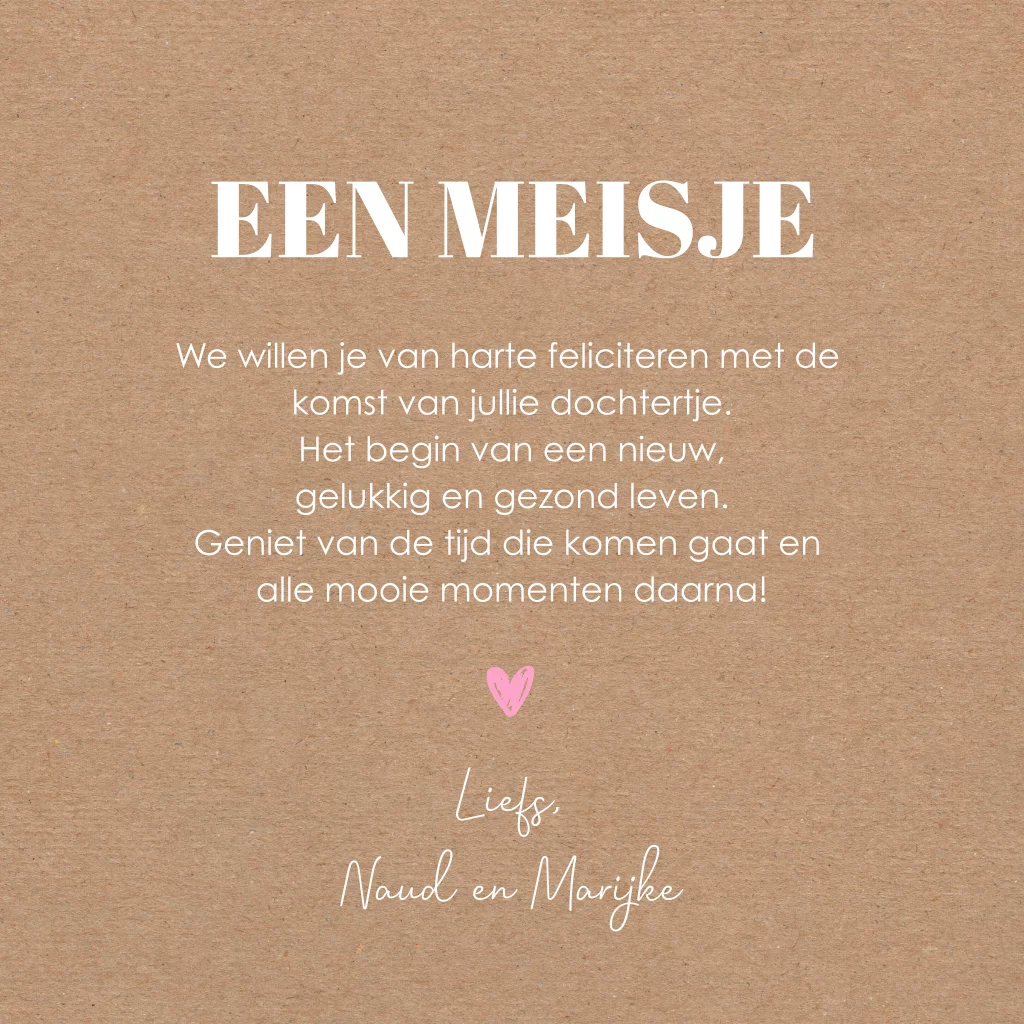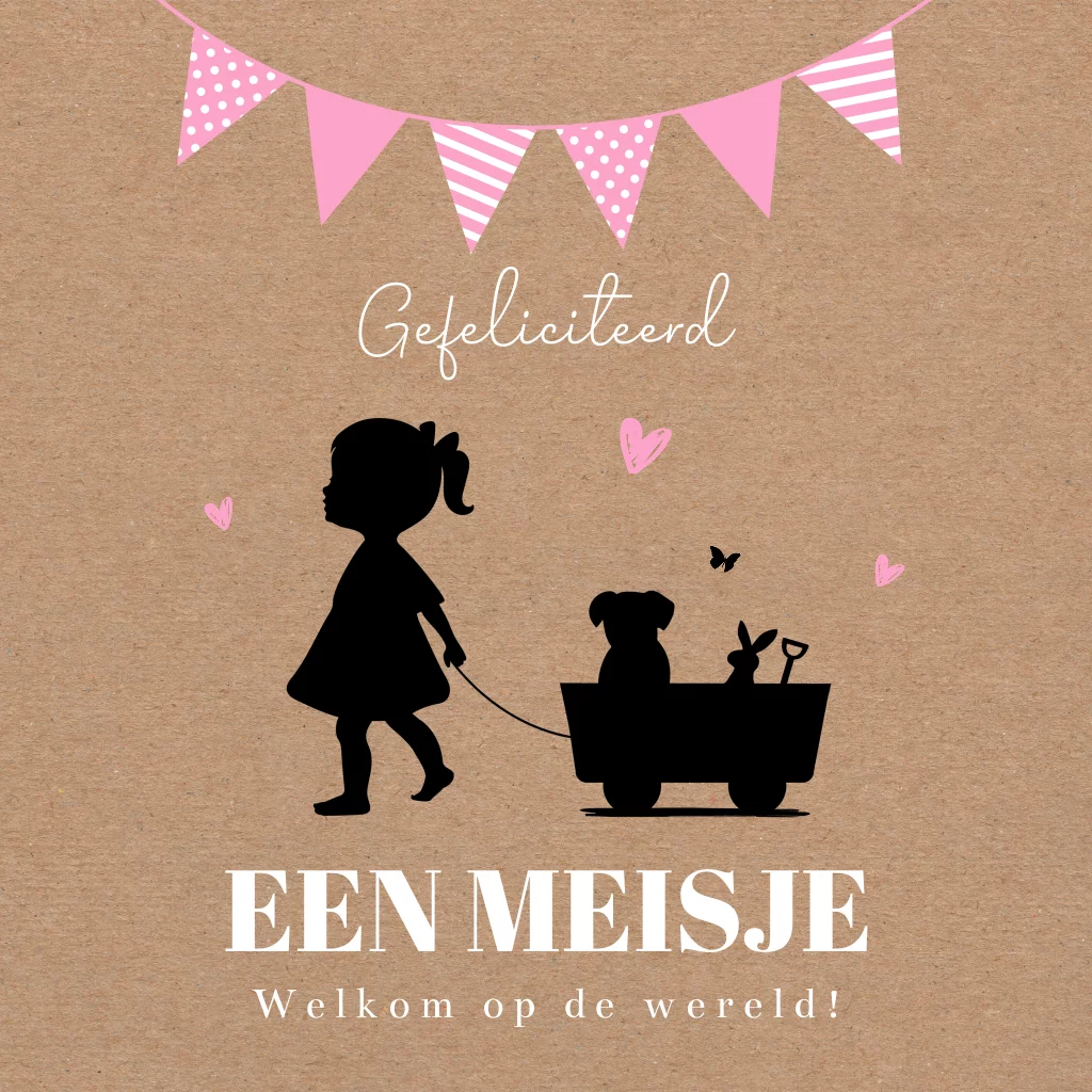 Felicitatie kaart geboorte dochter baby meisje met silhouet kar, hartjes en slinger roze.