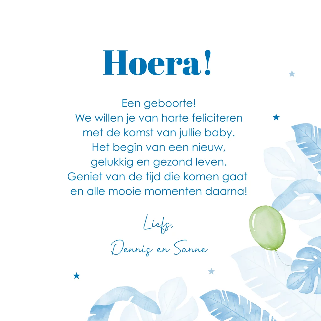 Felicitatie kaart geboorte zoon baby jongen met jungle dieren giraffe, ballonnen en tropische bladeren blauw.
