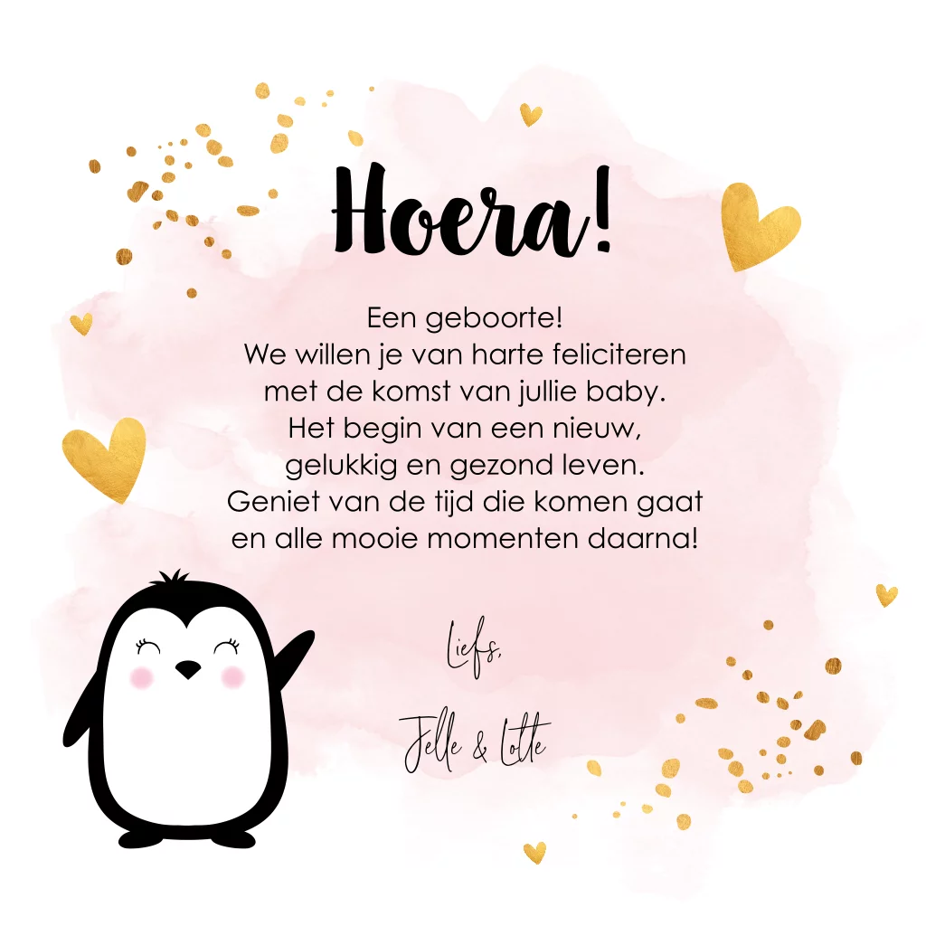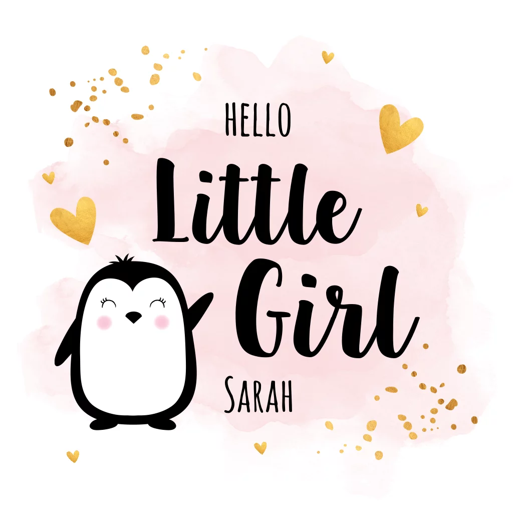 Felicitatie kaart geboorte dochter meisje baby met waterverf roze, dieren pinguïn, goudlook hartjes en tekst Hello Little Girl.