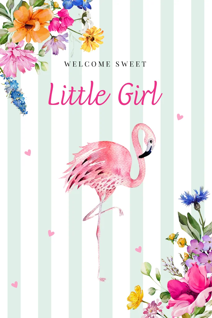 Felicitatie kaart geboorte dochter baby meisje met flamingo roze en ballonnen.