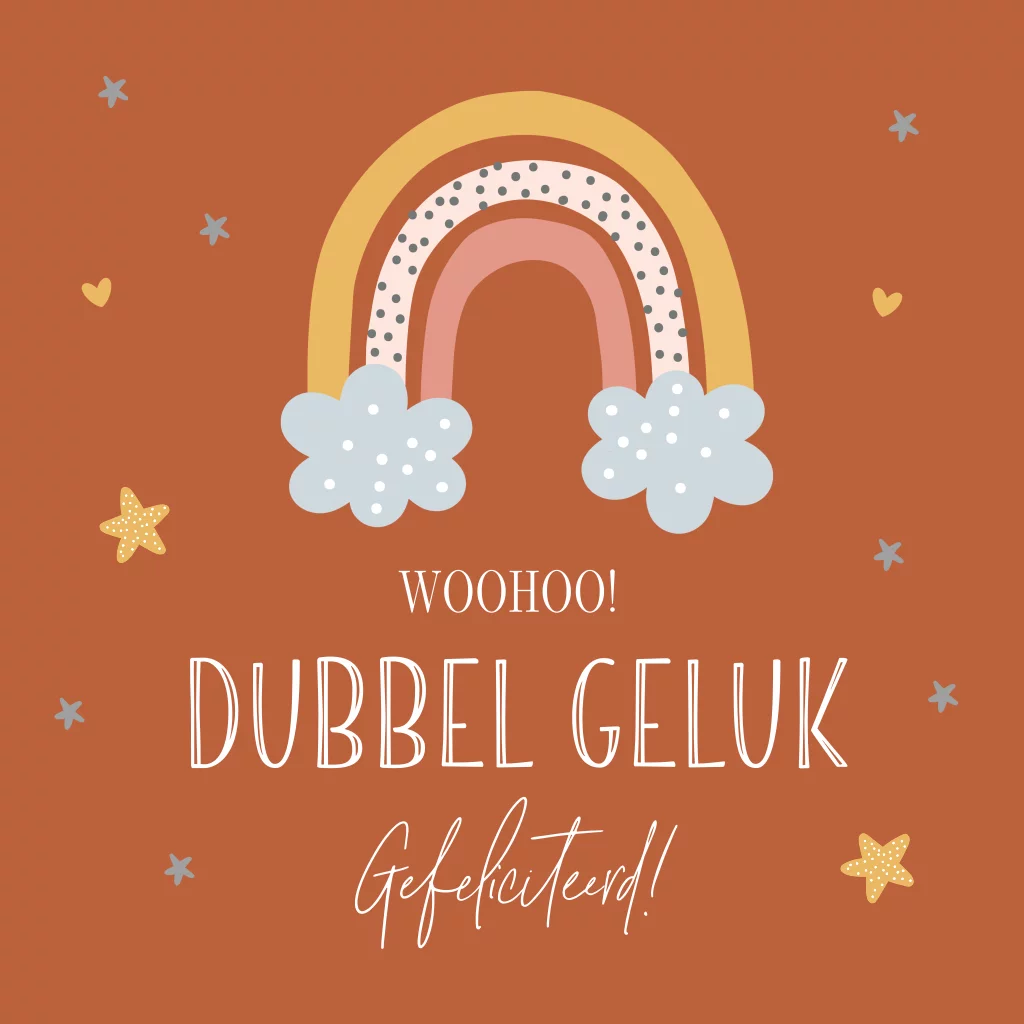Felicitatie kaart geboorte tweeling met regenboog roestbruin