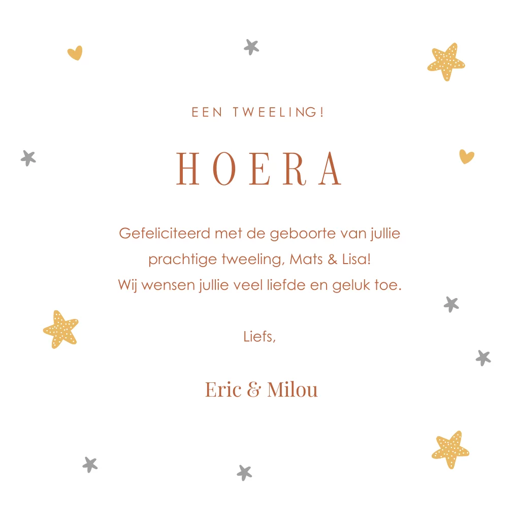 Felicitatie kaart geboorte tweeling met regenboog roestbruin en okergeel.
