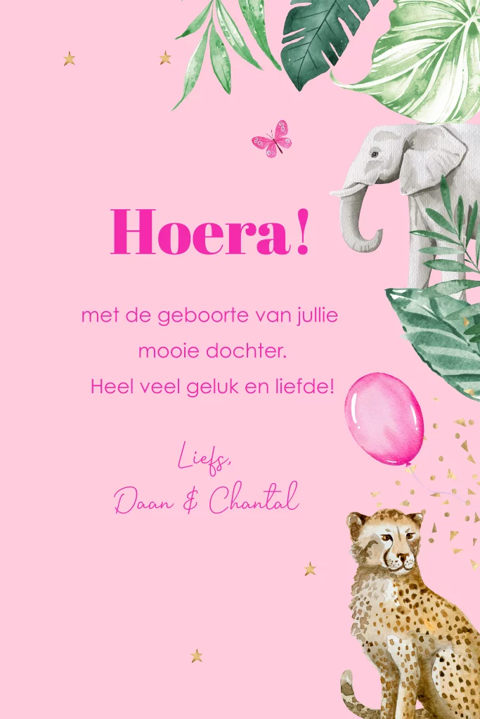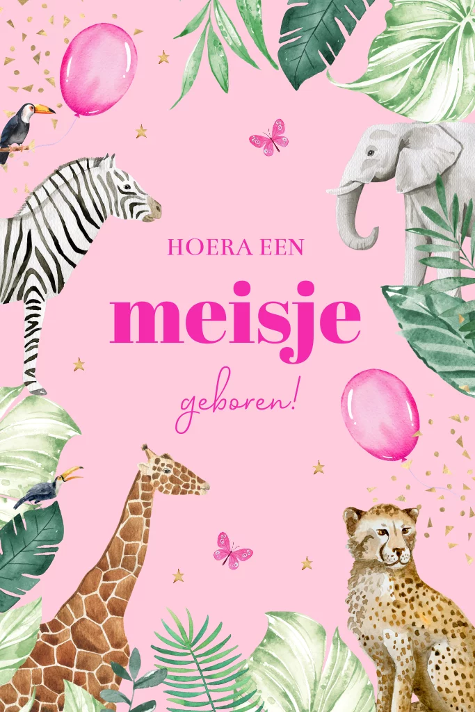 Felicitatie geboorte dochter jungle dieren roze