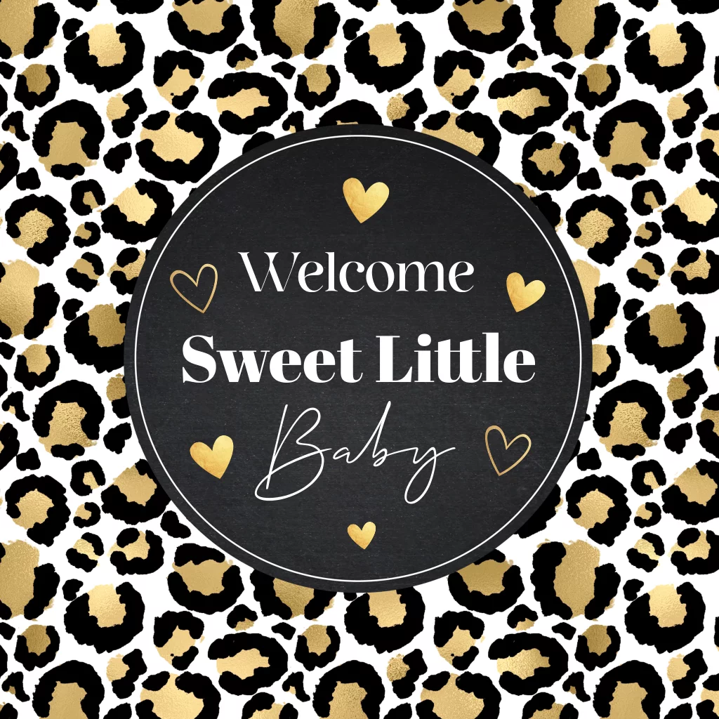 Felicitatie kaart geboorte dochter baby meisje met panterprint goudlook en hartjes. Welcome sweet little baby!