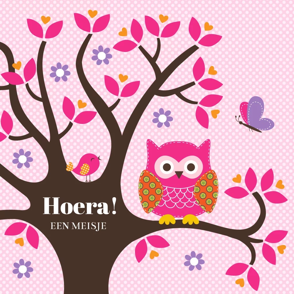 Felicitatie kaart geboorte baby meisje roze met uiltje in boom