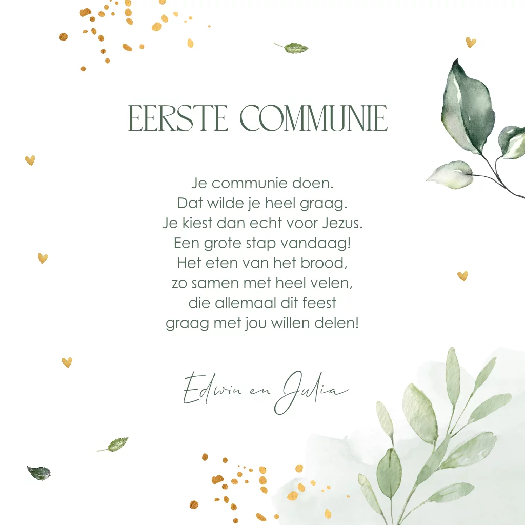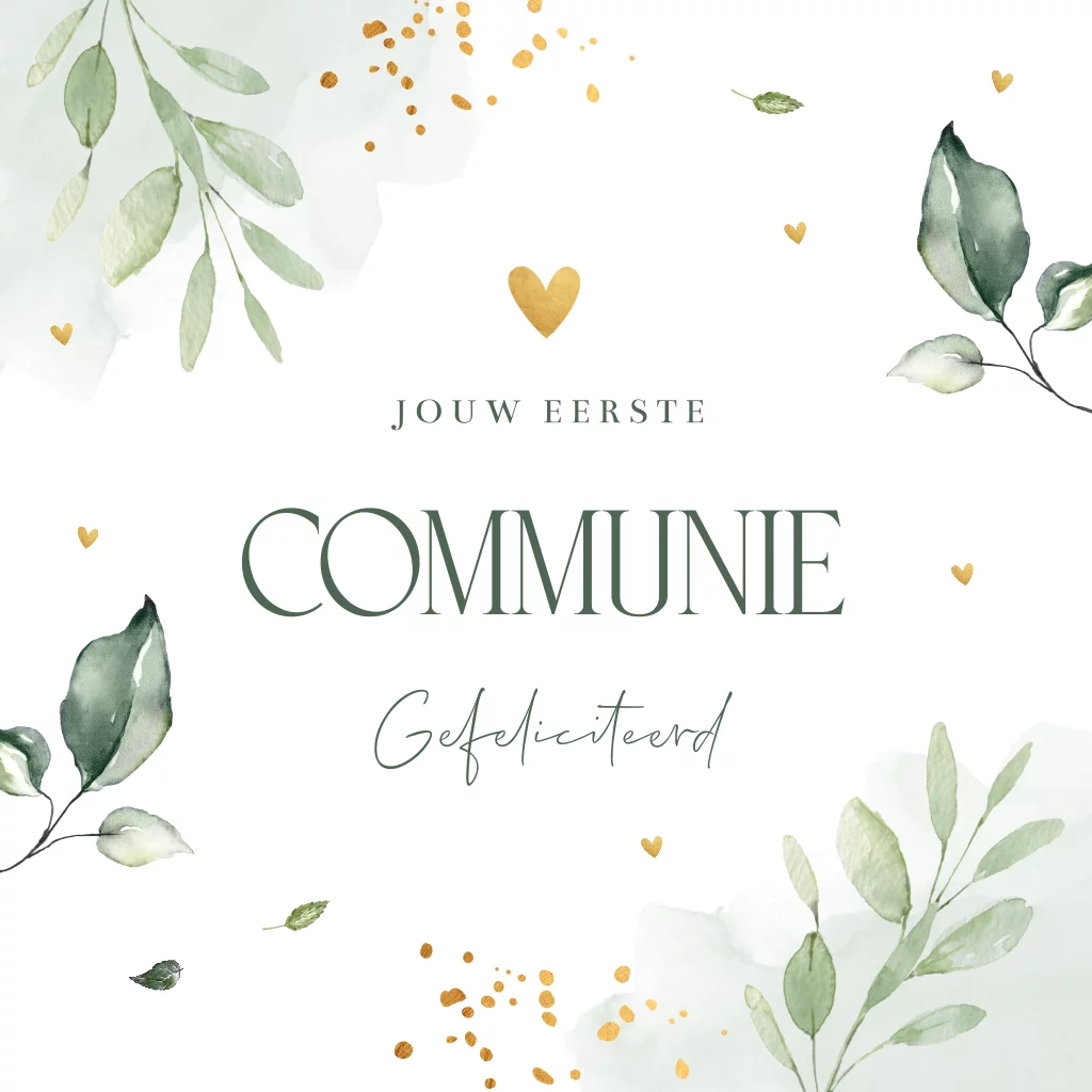 Communie felicitatie kaart voor een jongen botanisch groen met waterverf bladeren.