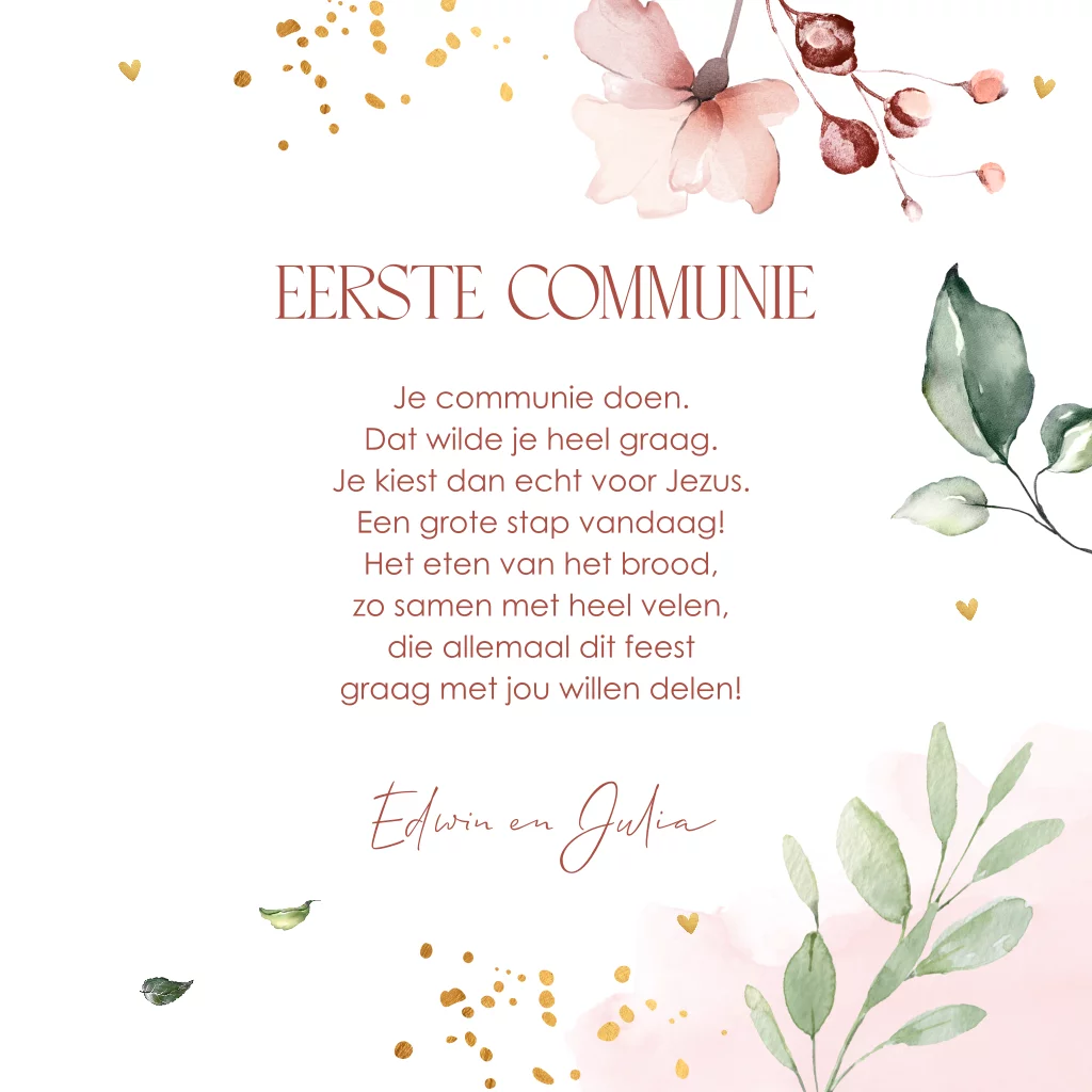 Communie felicitatie kaart voor een meisje met roze bloemen, bladeren en watercolour.