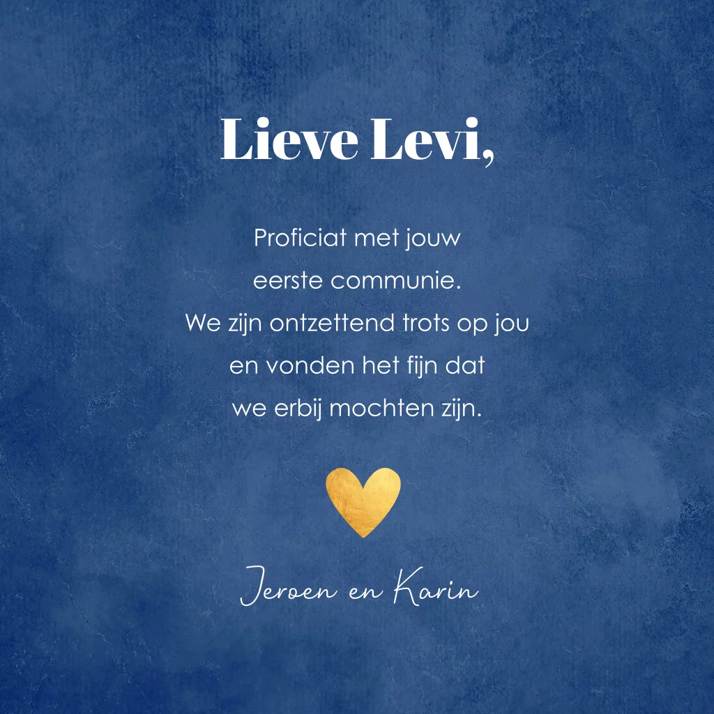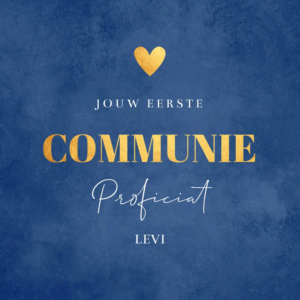 Communie felicitatie kaart voor een jongen blauw met goudlook hartje.