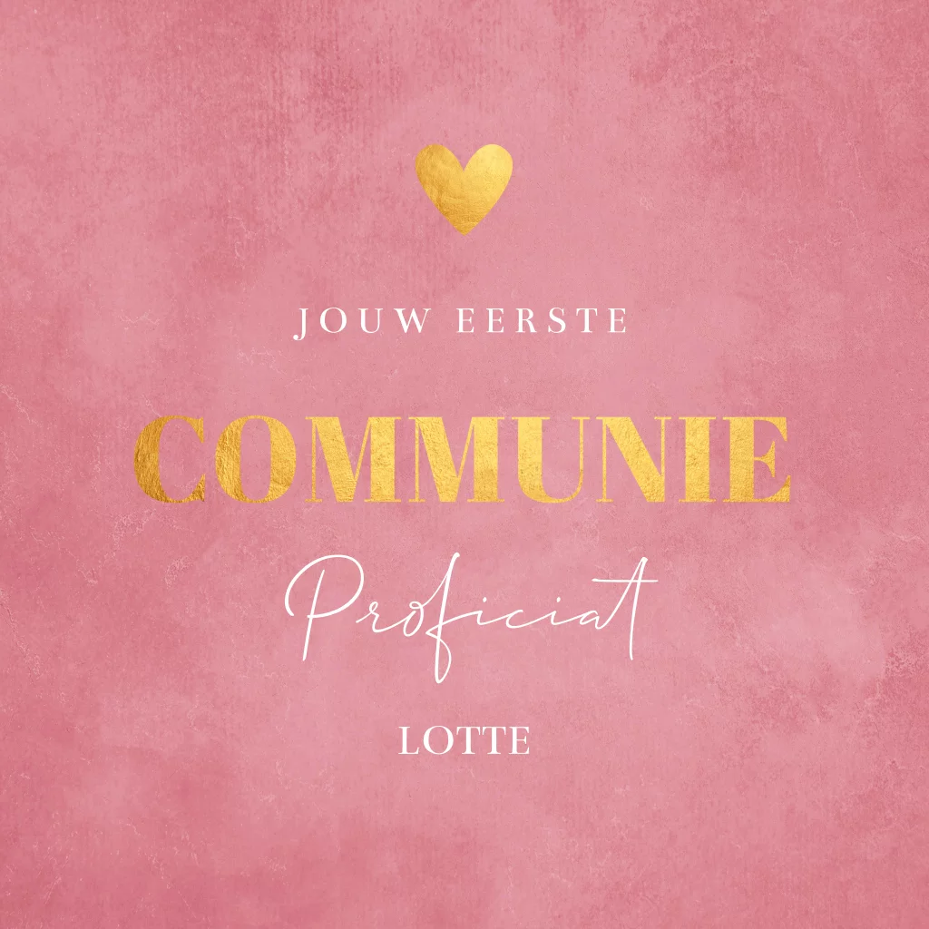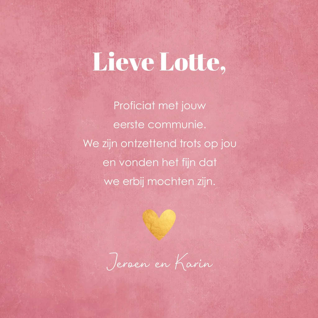 Felicitatie communie kaart voor een meisje roze met hartje goudlook.