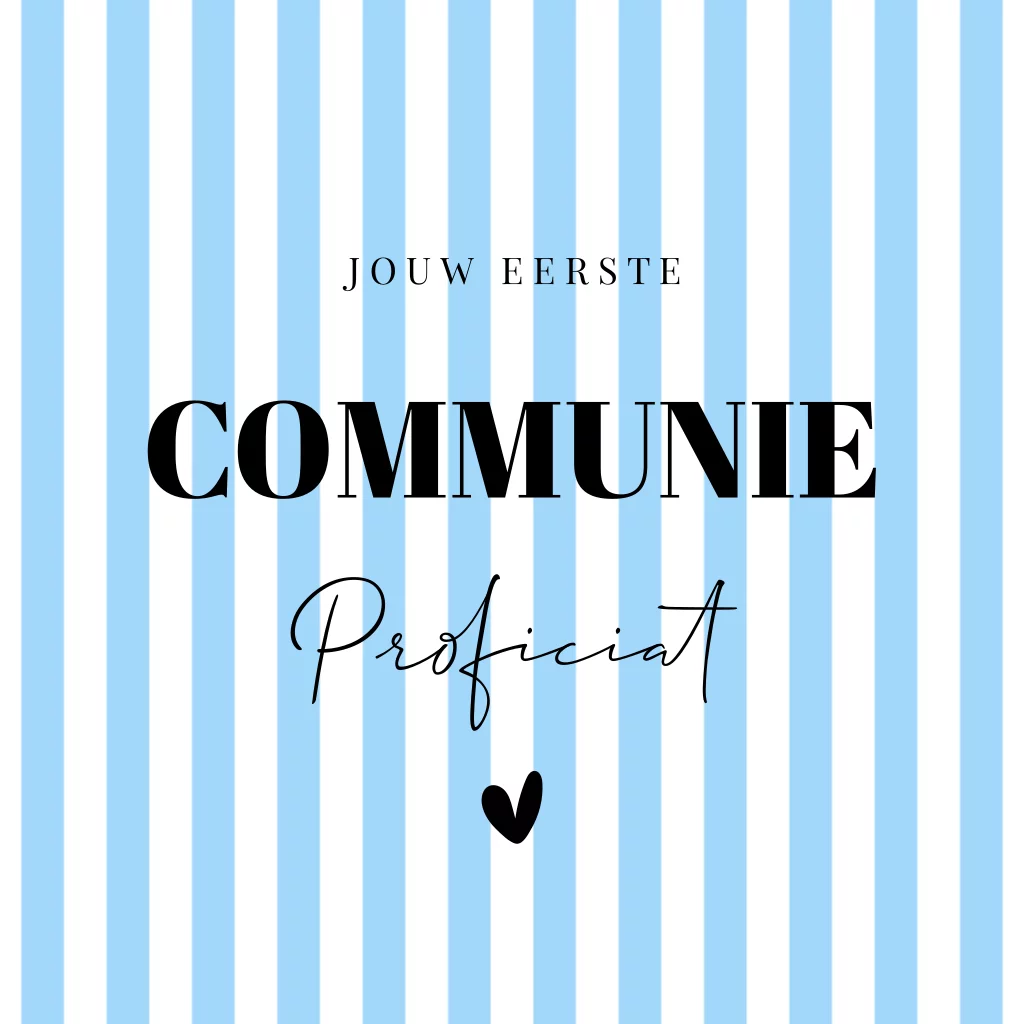 Communie felicitatie kaart voor een jongen blauw met strepen, typografie en hartje.
