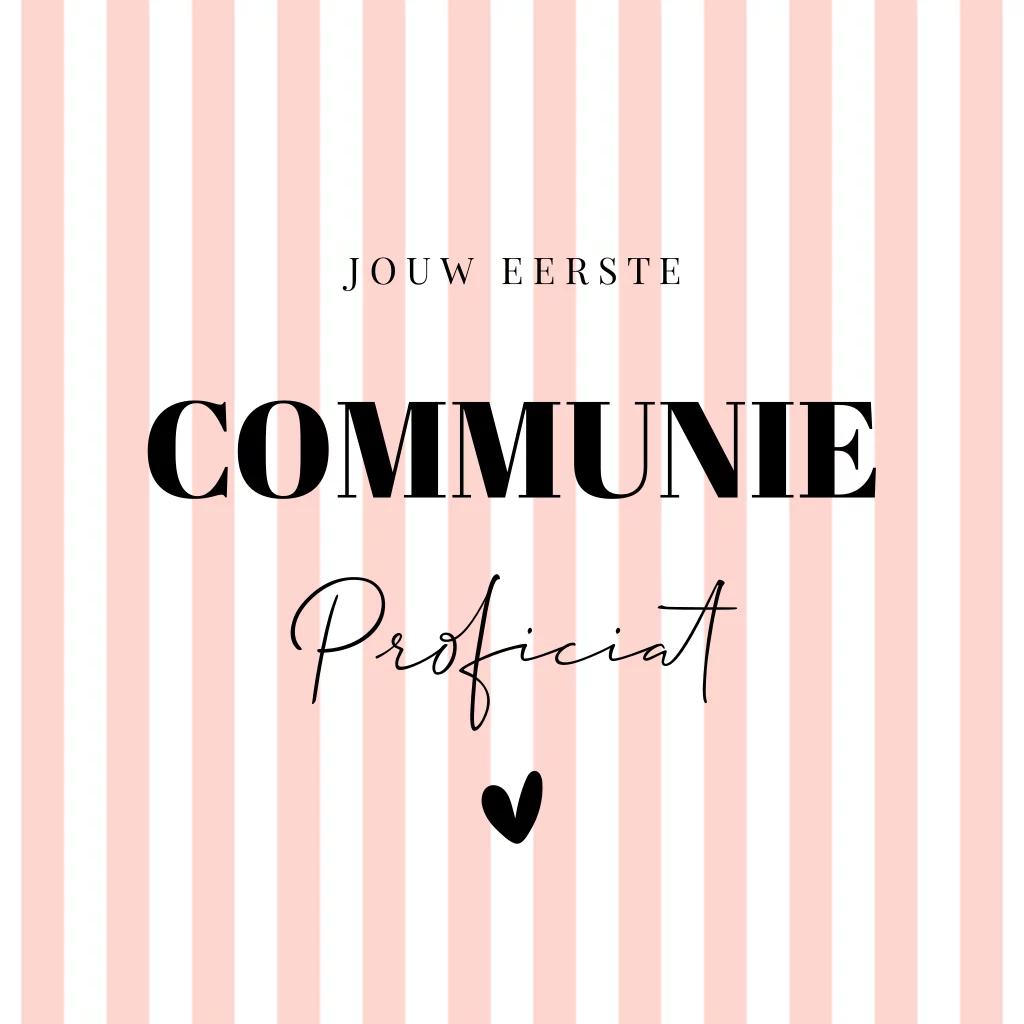 Communie felicitatie kaart voor een meisje met roze strepen, typografie en hartje.