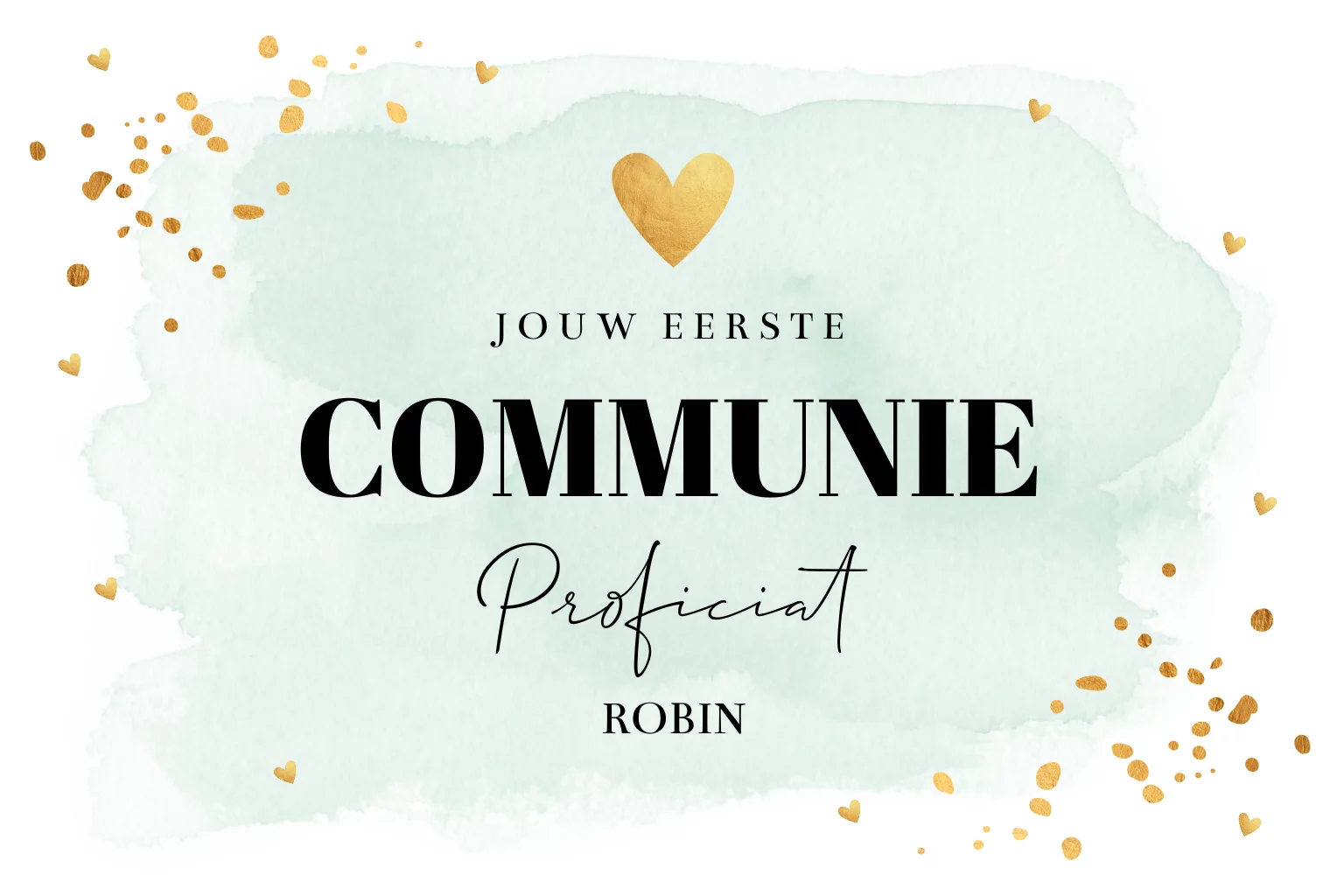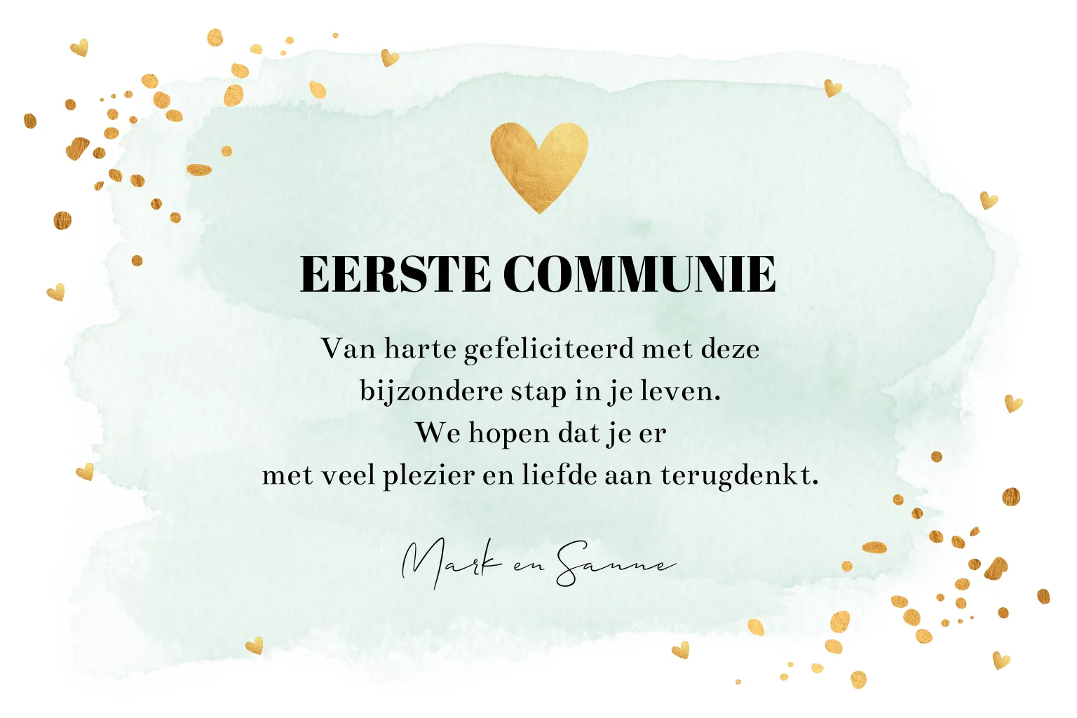 Felicitatie eerste communie kaart voor een jongen groen met watercolour en goudlook hartjes. Geen folie!