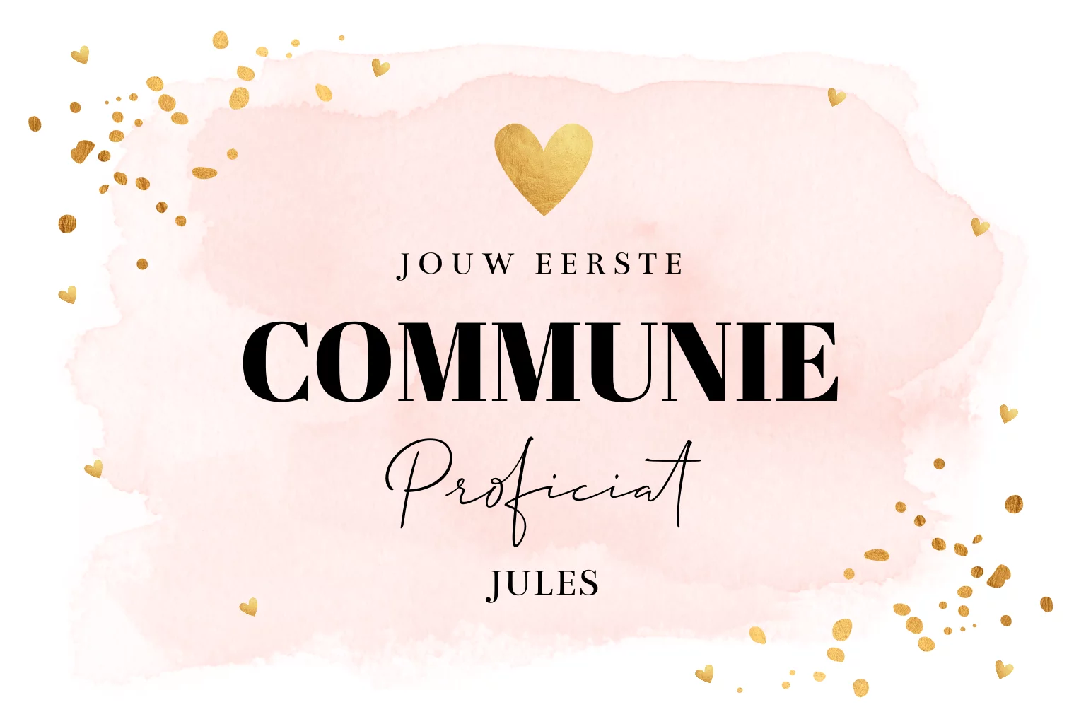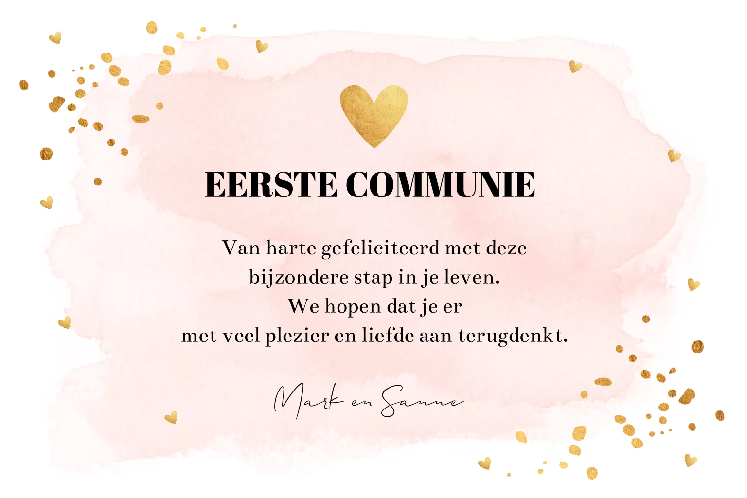 Felicitatie eerste communie kaart voor een meisje met watercolour roze en goudlook hartjes. Geen folie!