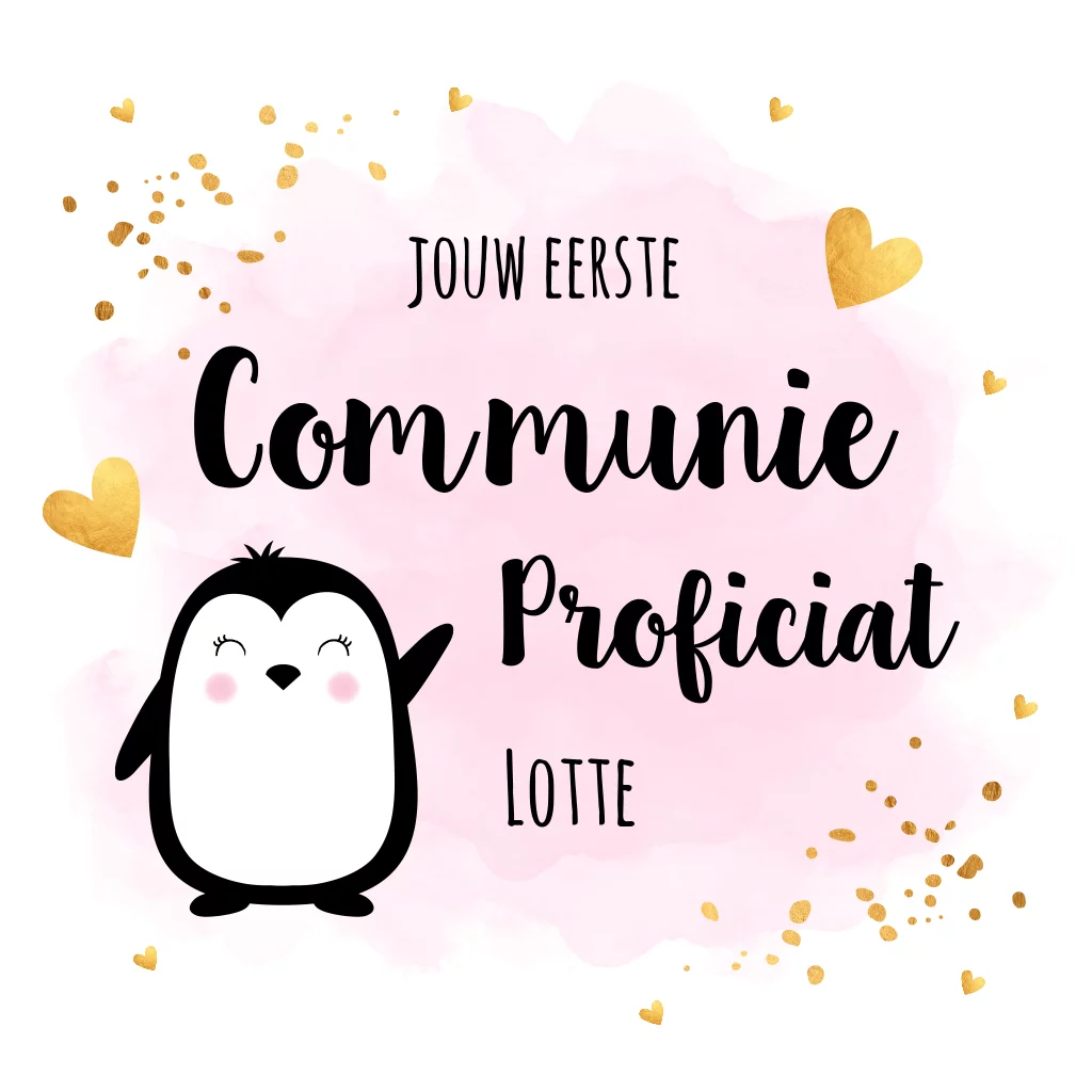 Felicitatie eerste communie kaart meisje dieren pinguïn roze goudlook