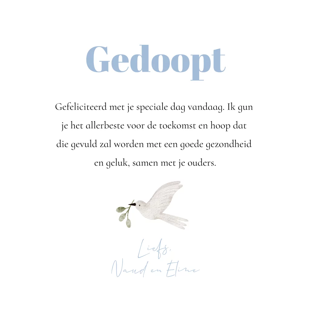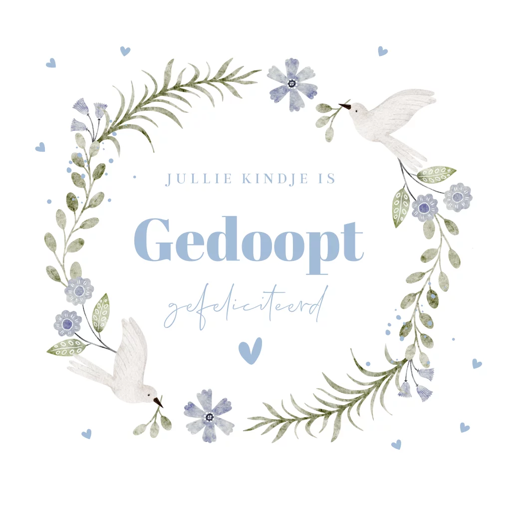 Felicitatie kaart doop jongen bloemenkrans vogels blauw