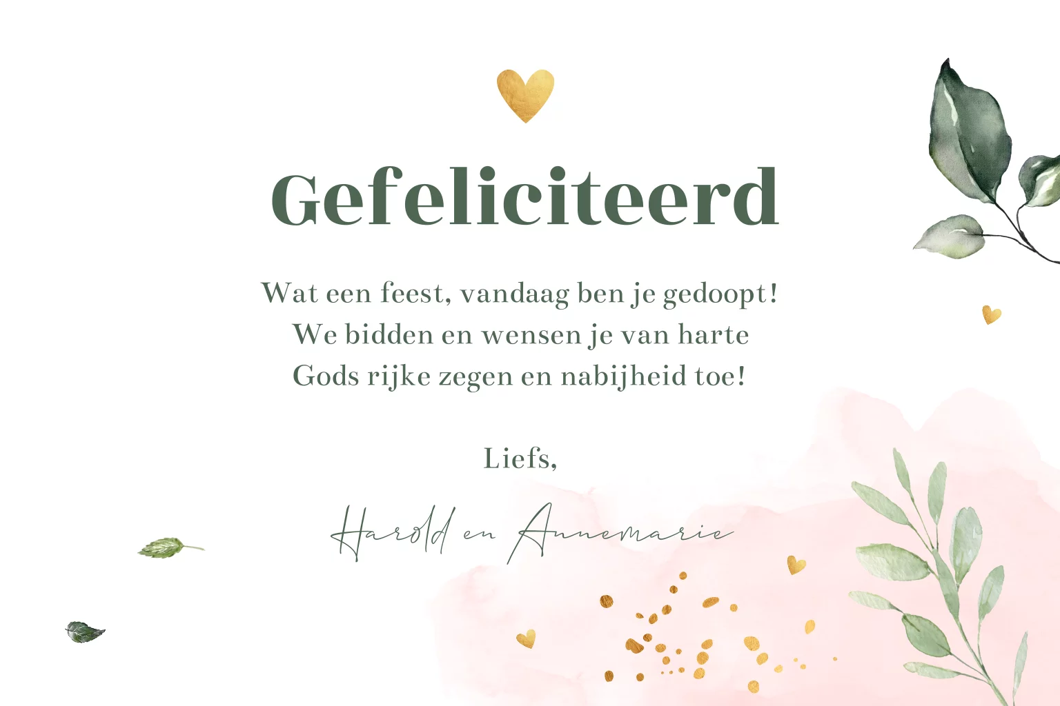 Felicitatie doop meisje botanisch waterverf roze bladeren