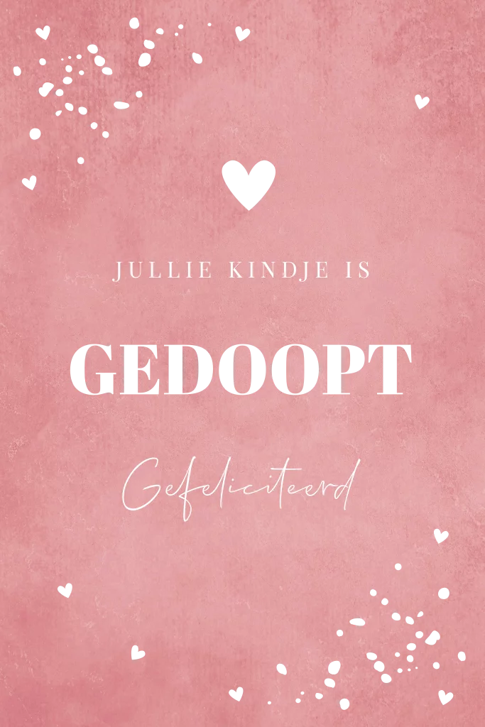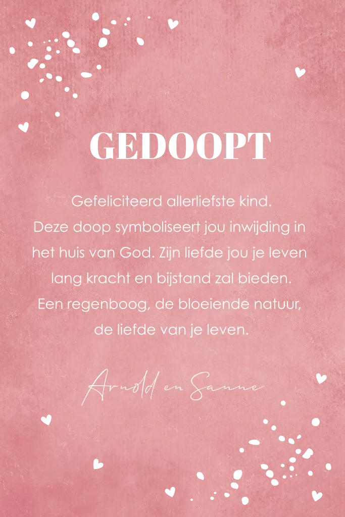 Felicitatie kaart doopviering voor een meisje roze met hartjes en goudfolie.
