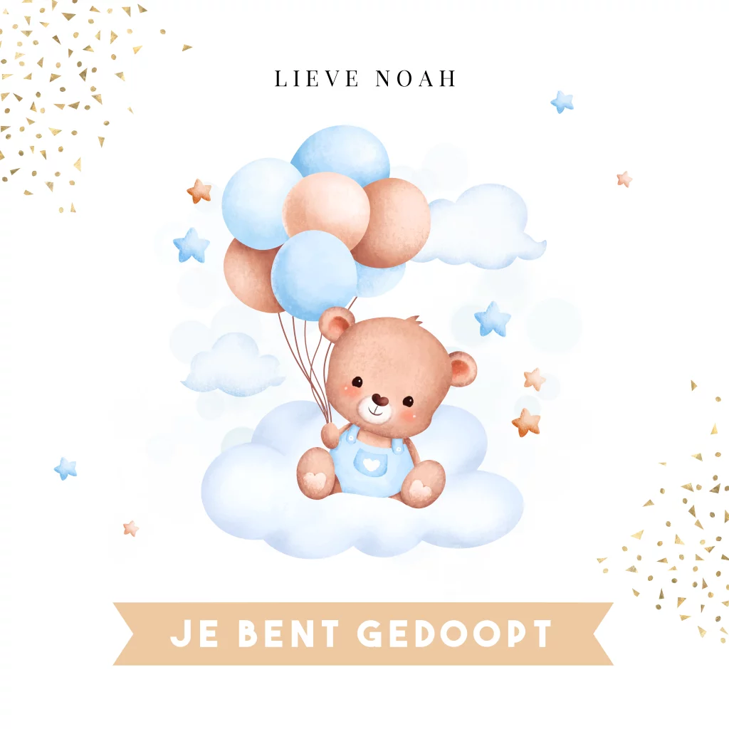 Felicitatie kaart doopviering voor een jongen met lief beertje met ballonnen.