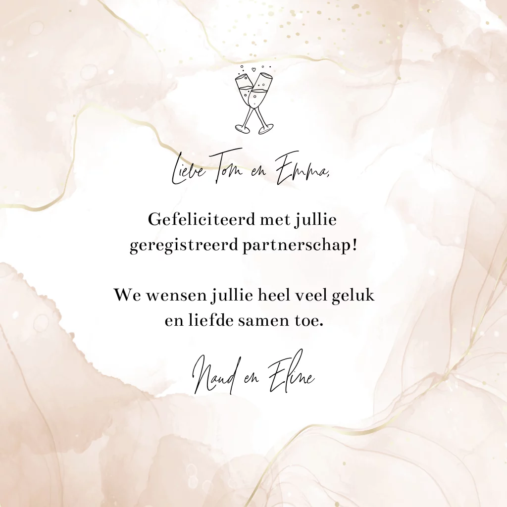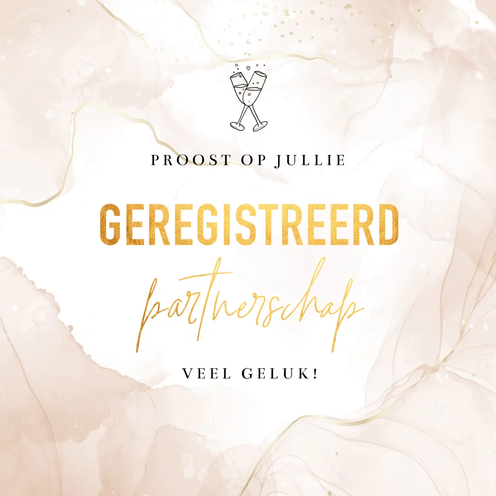 Felicitatie geregistreerd partnerschap beige met marmerlook en "Proost op jullie geregistreerd partnerschap" in goudlook. Geen folie!