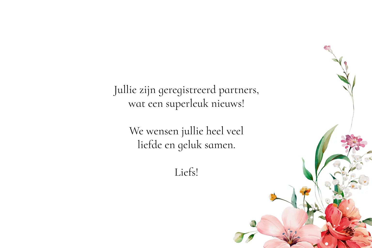 Felicitatie geregistreerd partnerschap kaart met roze bloemen en goudfolie.