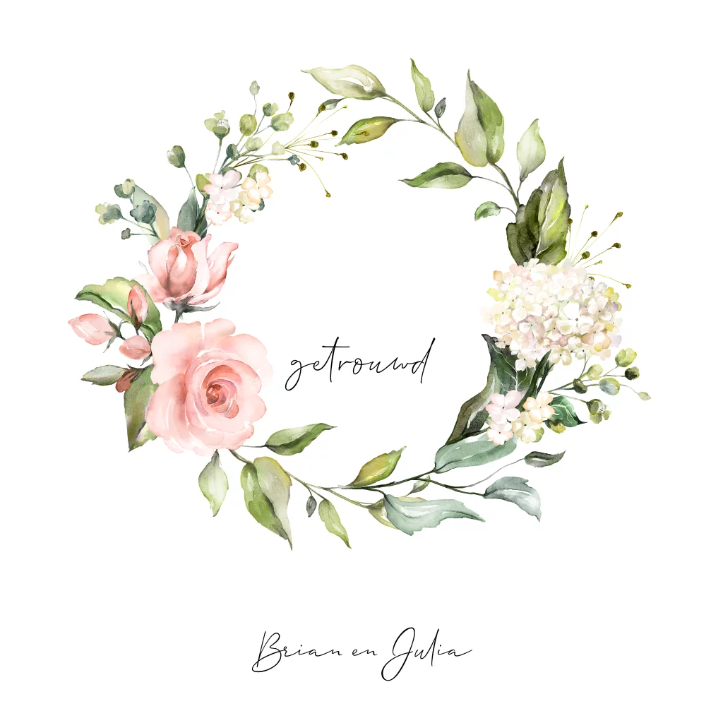 Felicitatie pas getrouwd huwelijk met bloemenkrans en goudfolie.
