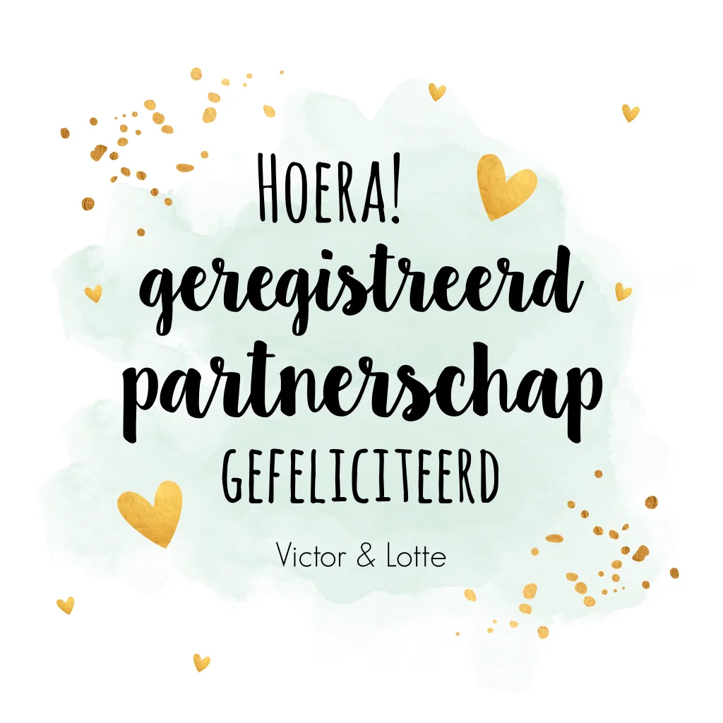 Felicitatie geregistreerd partnerschap kaart met waterverf groen en goudlook hartjes. Geen folie!