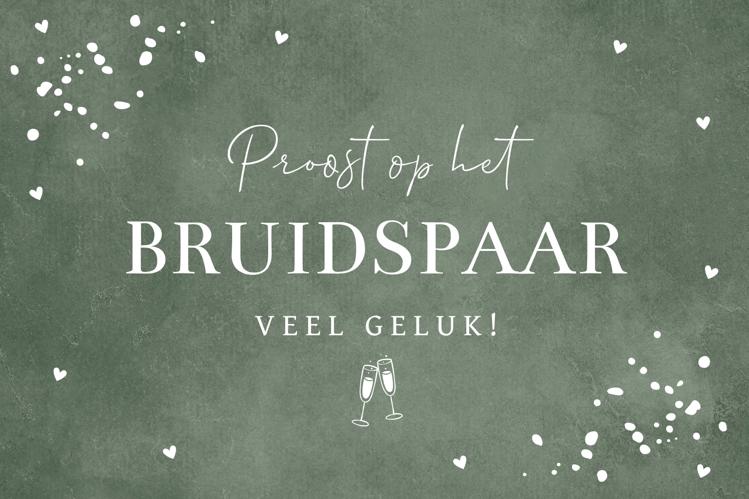 Felicitatie pas getrouwd huwelijk kaart groen met goudfolie en tekst "proost op het bruidspaar veel geluk".