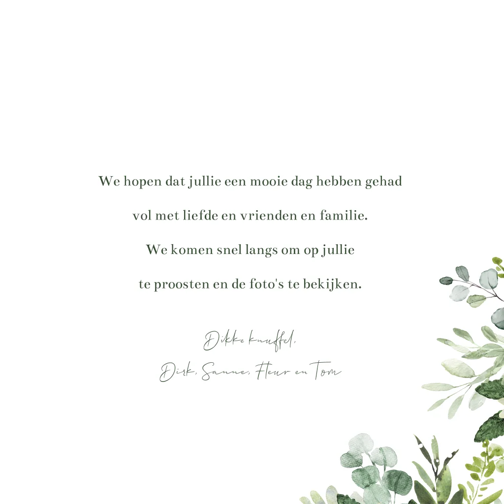 Felicitatie kaart pas getrouwd floral botanisch groen en goudfolie.