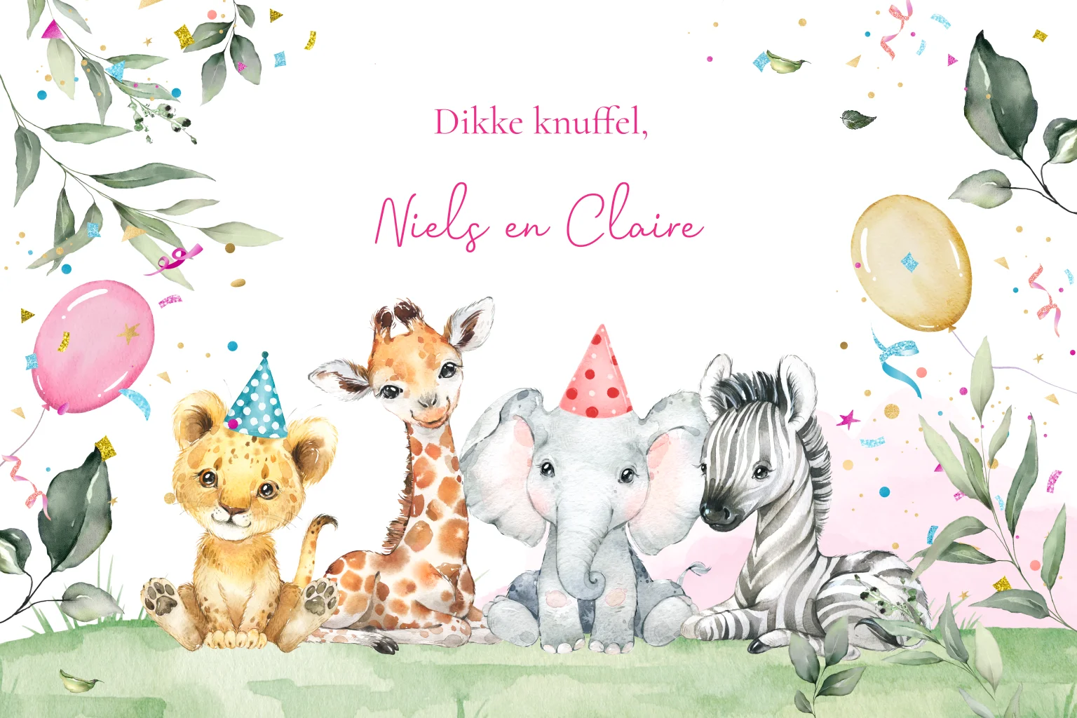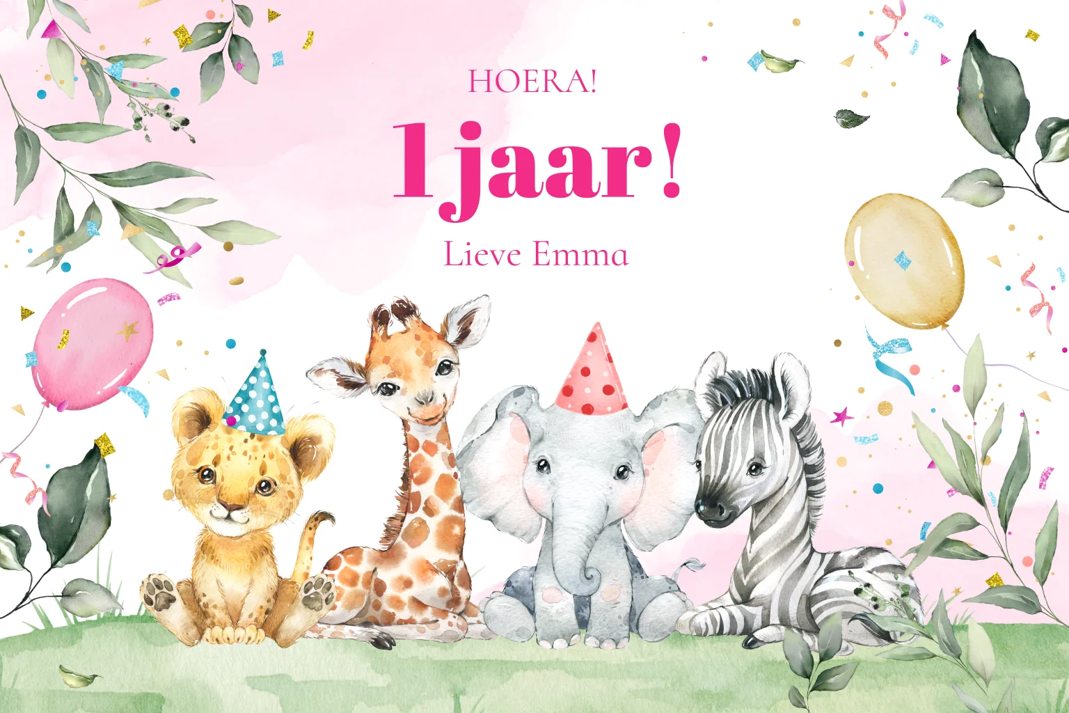 Verjaardagskaart voor een meisje 1 jaar met jungle, safari dieren en ballonnen roze. Pas de leeftijd naar wens aan!