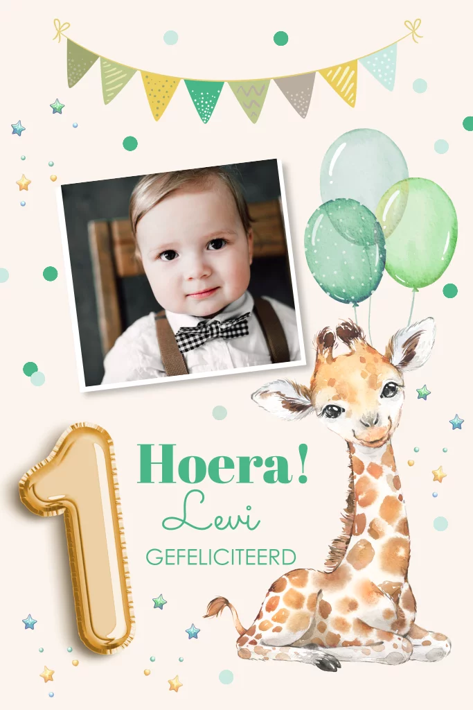 Felicitatie kind 1 jaar jongen foto giraffe ballonnen
