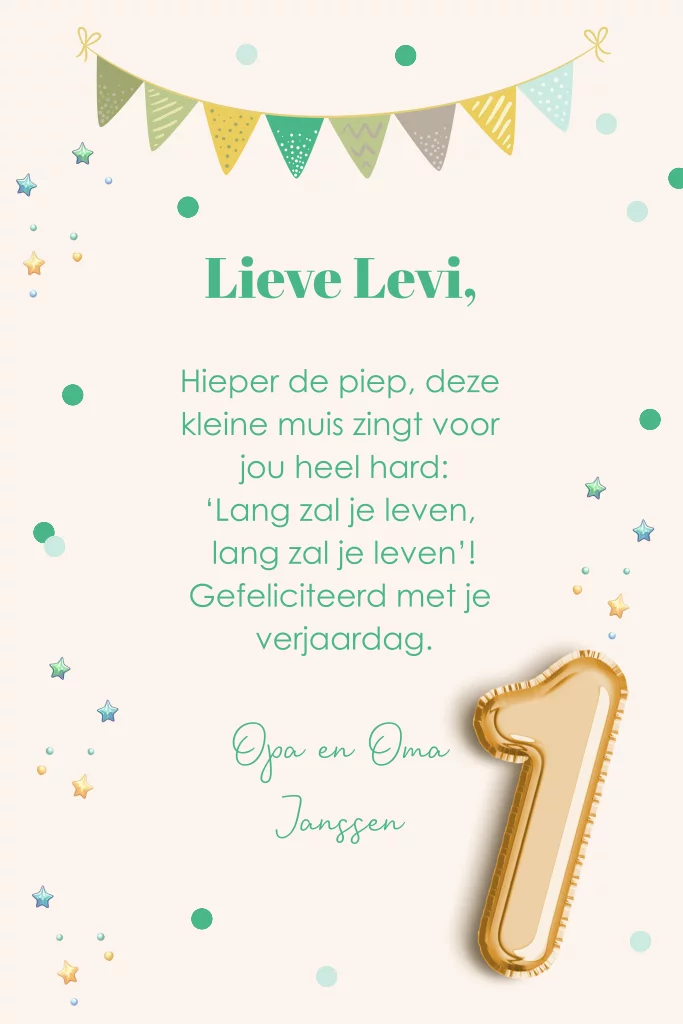 Leuke vrolijke felicitatiekaart voor een jongen 1 jaar met foto, giraffe, slinger, ballonnen en confetti.