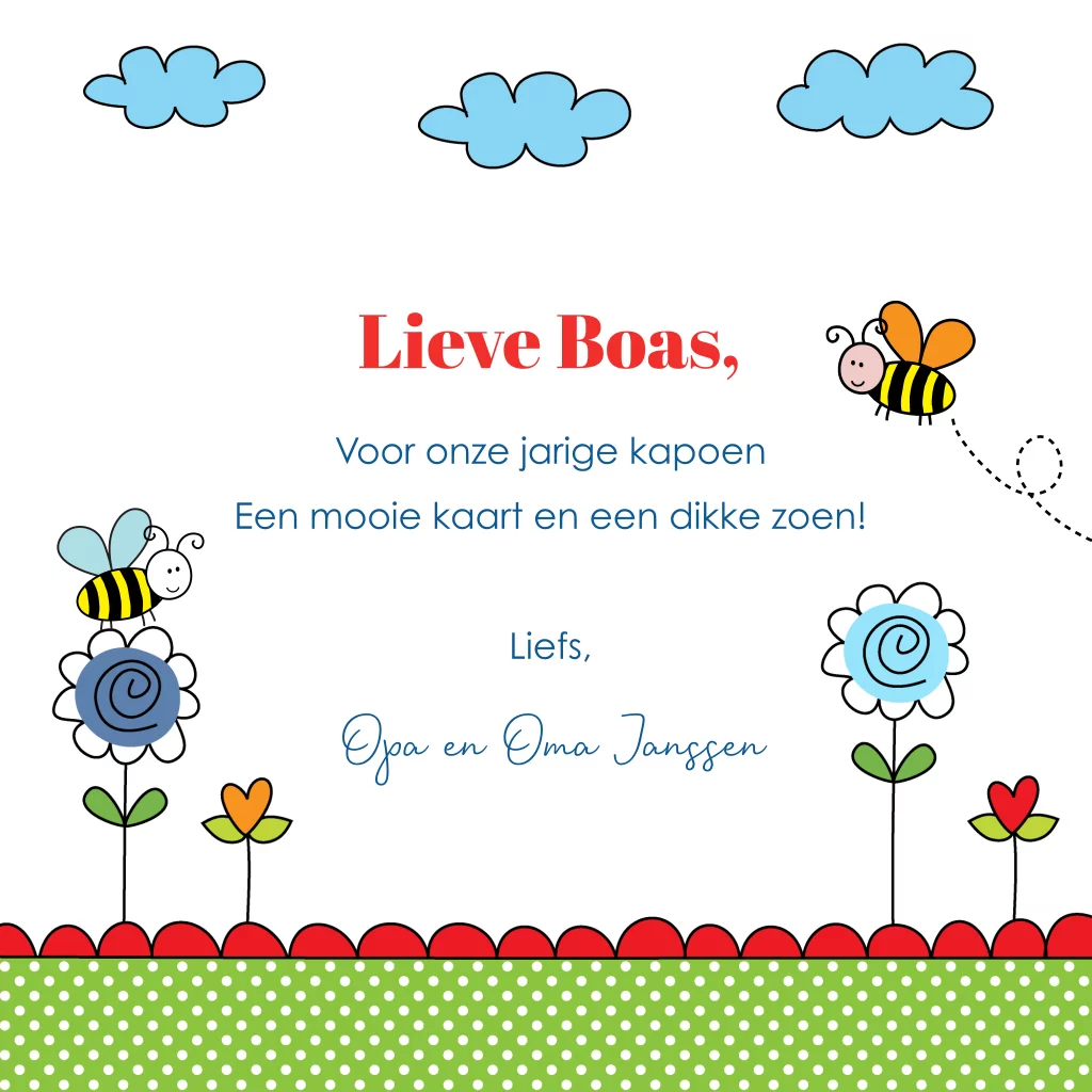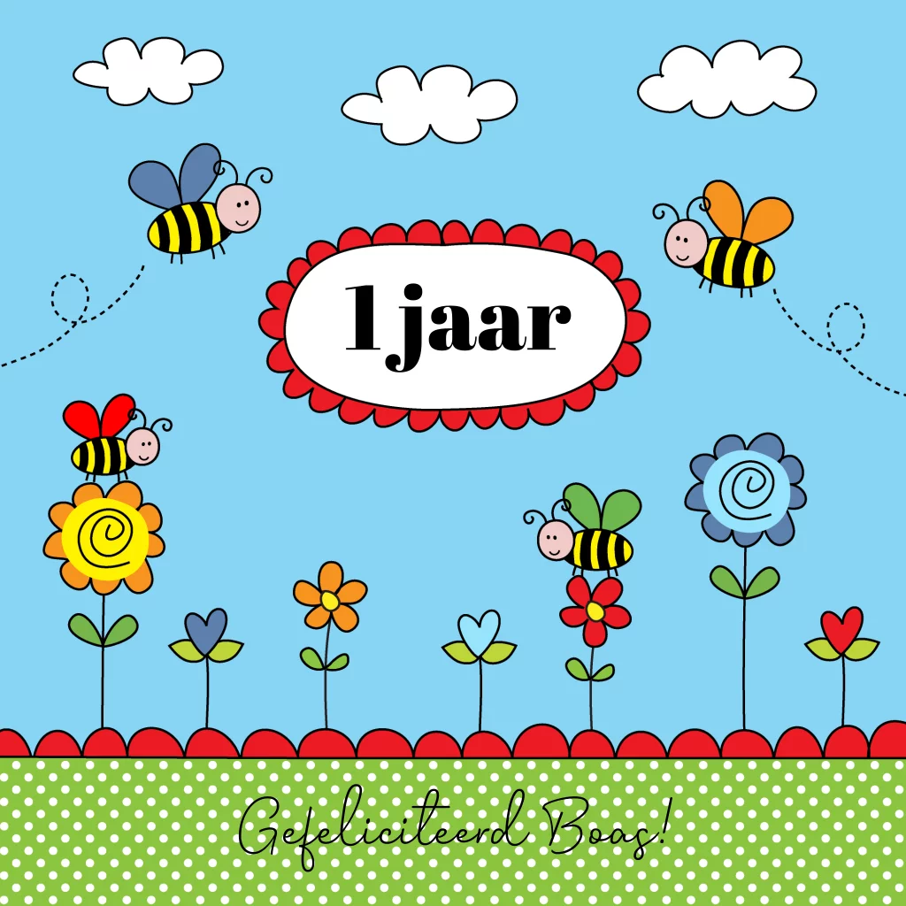 Verjaardagskaart kind 1 jaar jongen dieren bijtjes bloemen blauw