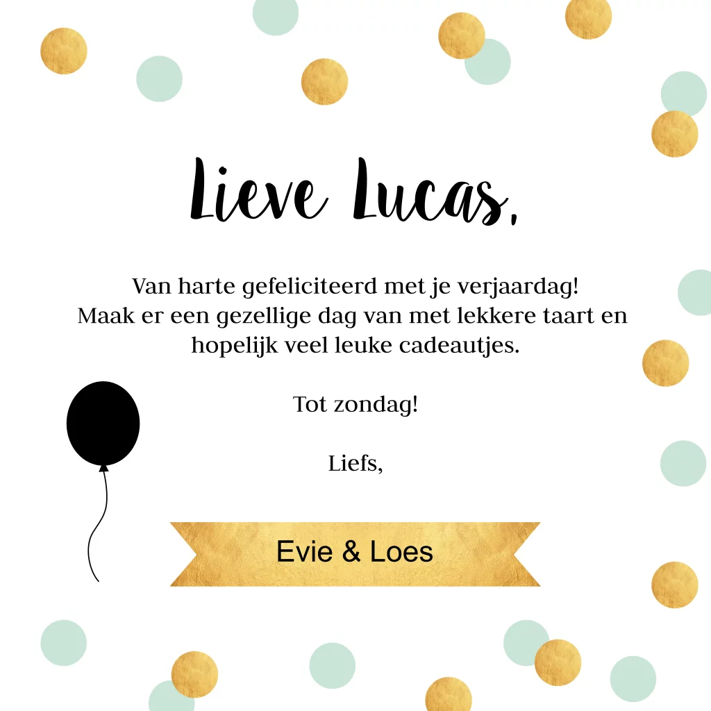 Verjaardagskaart voor een jongen met confetti dots mintgroen en goudlook. Geen goudfolie! Pas de leeftijd naar wens aan!