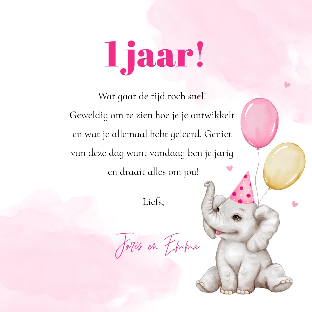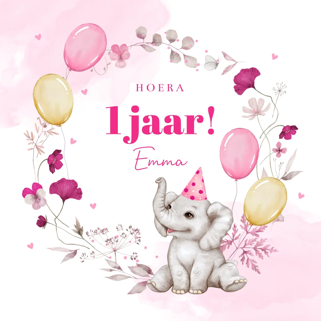 Felicitatie verjaardag meisje 1 jaar olifantje ballonnen bloemen roze