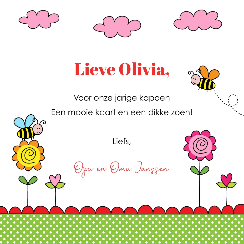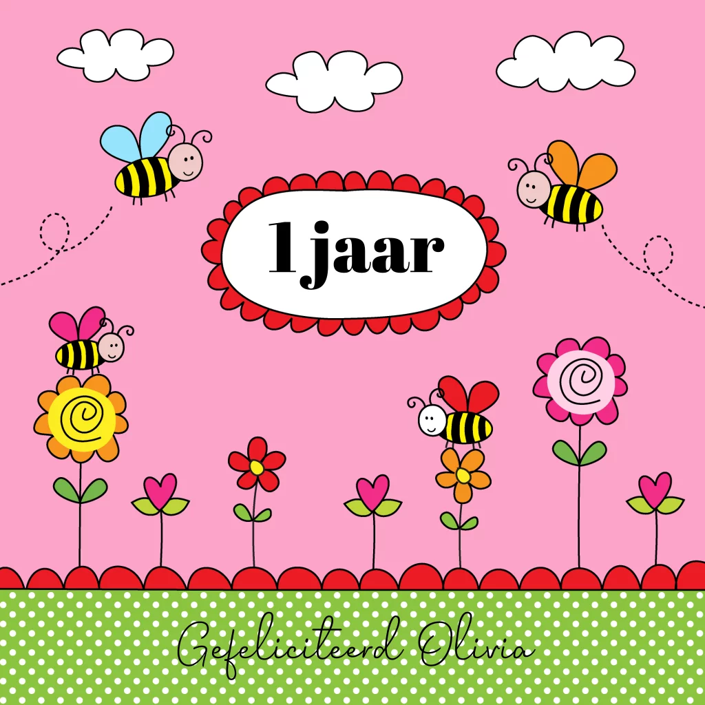 Verjaardagskaart kind 1 jaar meisje dieren bijtjes bloemen roze