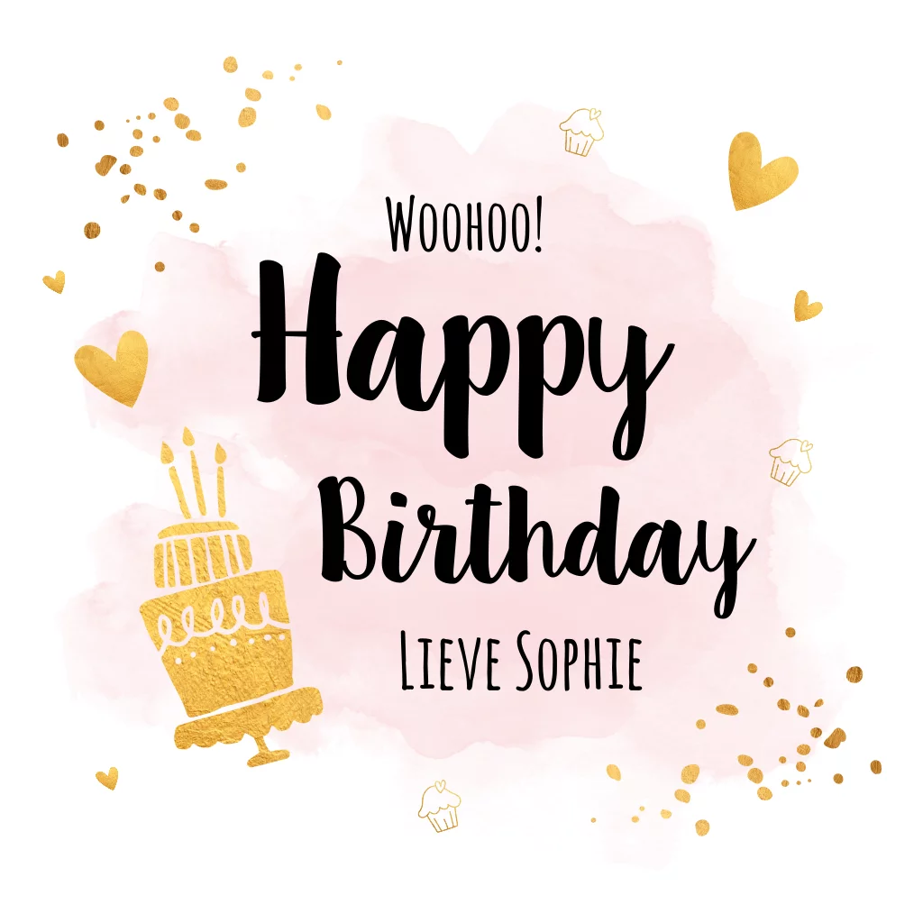 Verjaardagskaart voor een kind meisje met roze watercolour, goudlook taart, hartjes en spetters. Geen folie!