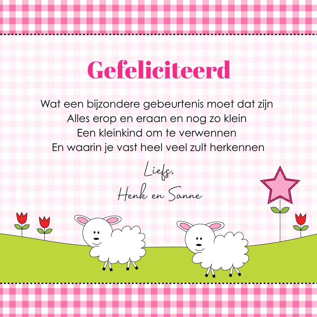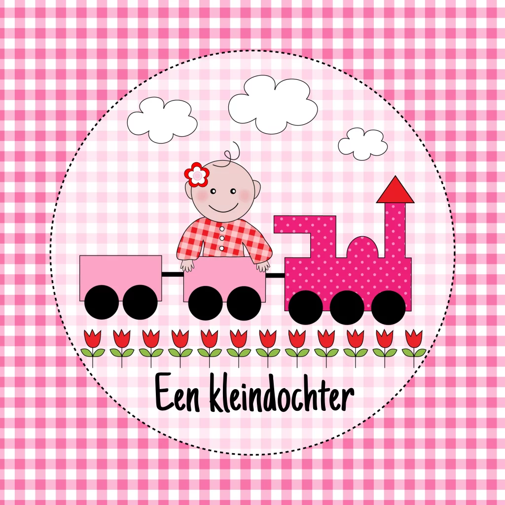 Felicitatie kaart kleindochter met baby in treintje, bloemen, wolkjes en roze ruitjes. Maak een mooie kaart online om opa en oma te feliciteren met hun kleinkind.