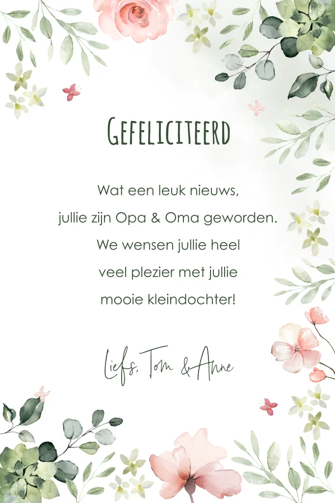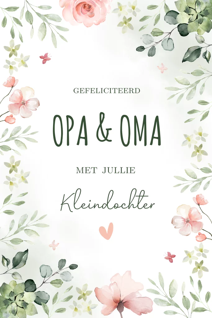 Felicitatie kaart kleindochter met watercolour bloemen. Maak een mooie kaart online om opa en oma te feliciteren met hun kleinkind.