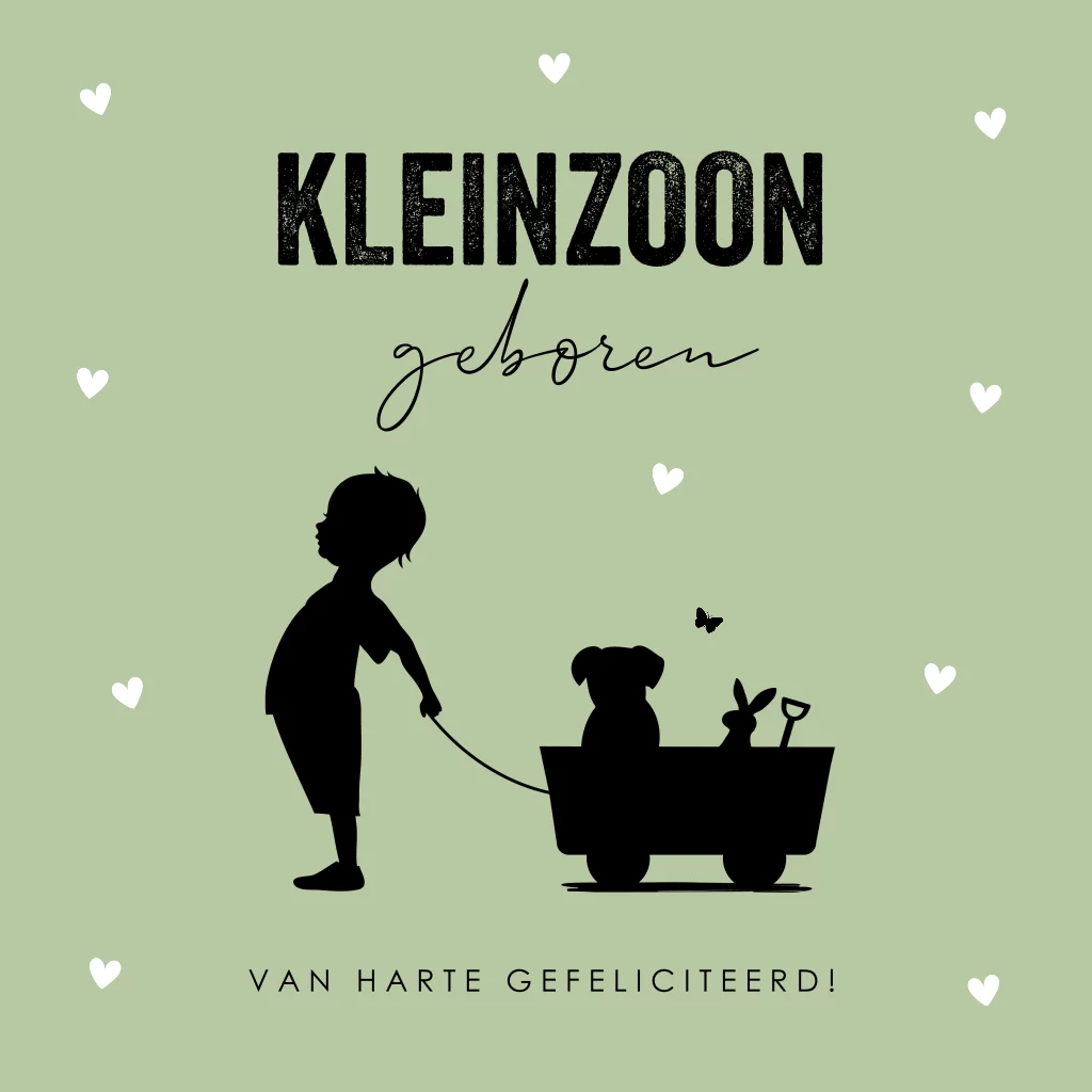 Felicitatie kaart kleinzoon groen met silhouet jongen met kar omringd door hartjes. Maak een mooie kaart online om opa en oma te feliciteren met hun kleinkind.