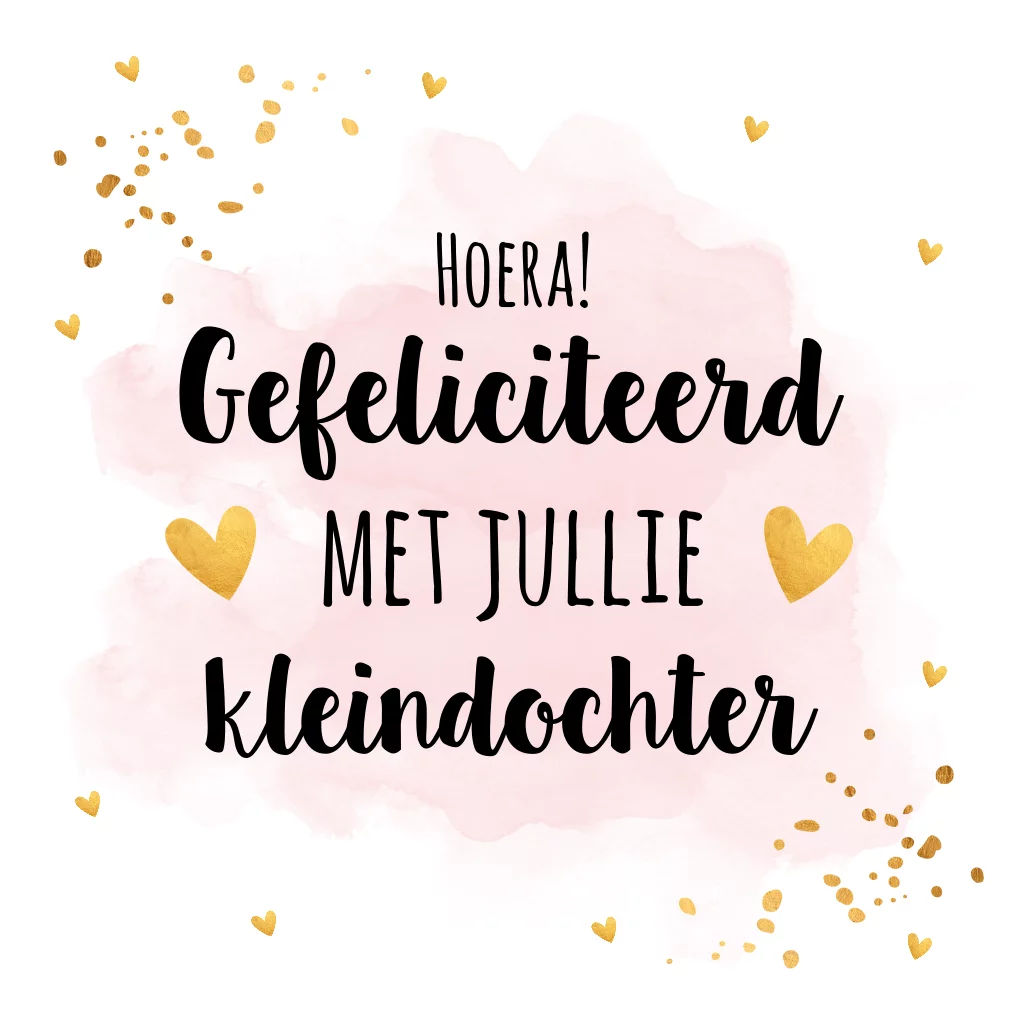 Felicitatie kaart kleindochter met watercolour roze, hartjes goudlook en mooie typografie. Maak een mooie kaart online om opa en oma te feliciteren met hun kleinkind.