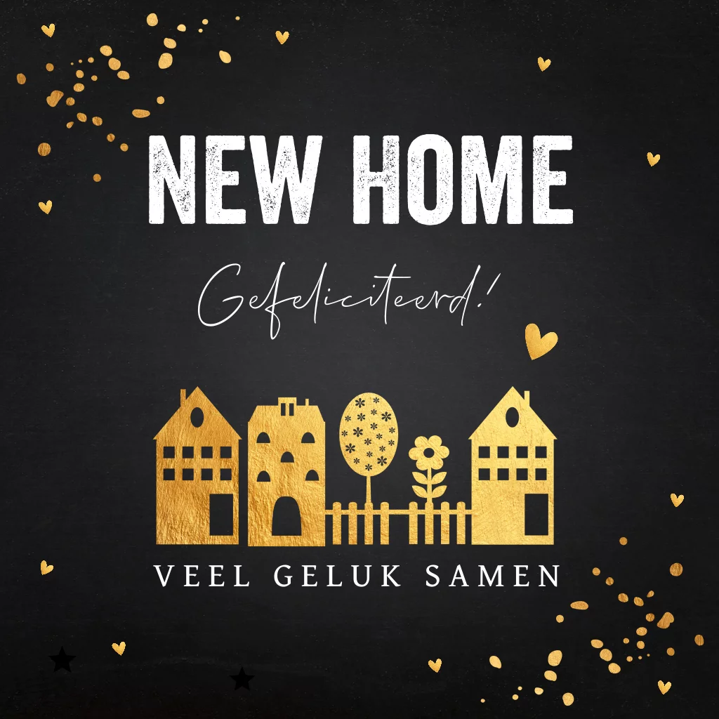 Felicitatie kaart nieuwe woning zwart goudlook huisjes