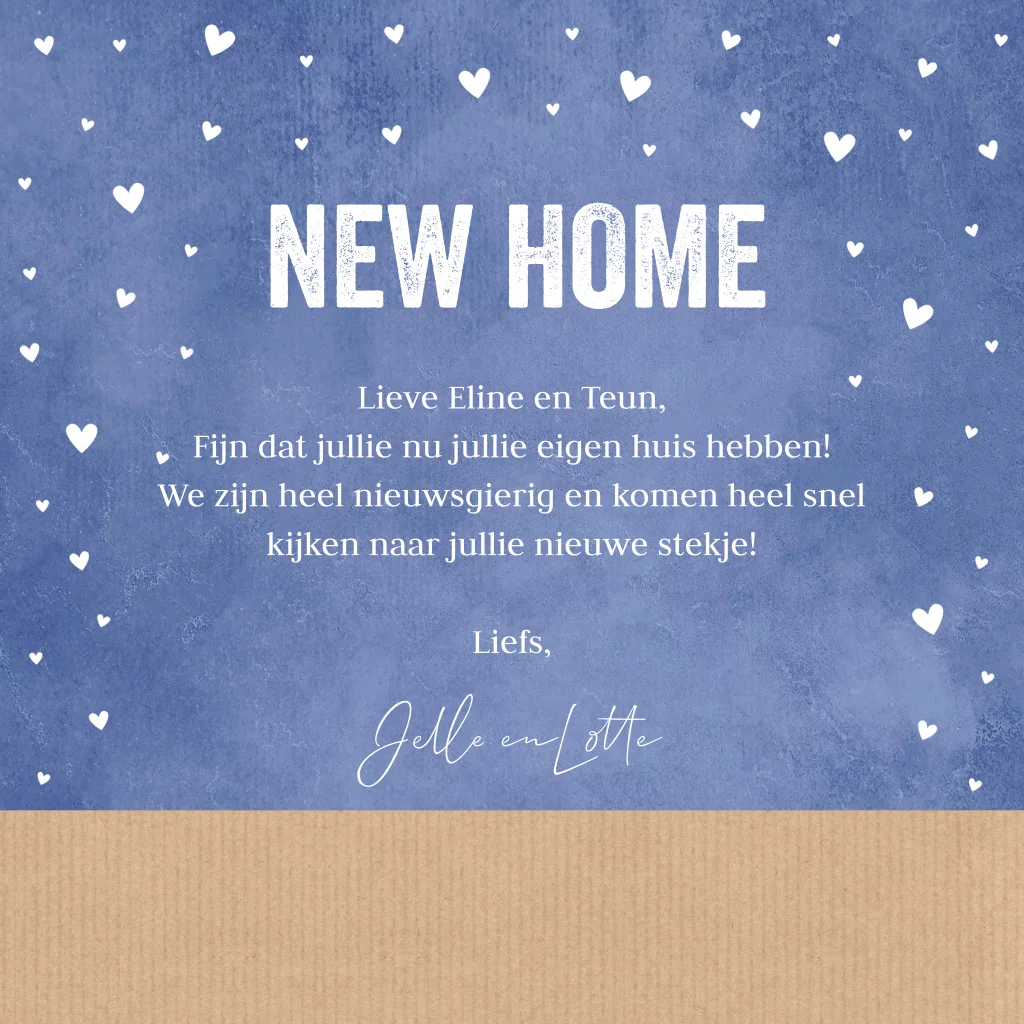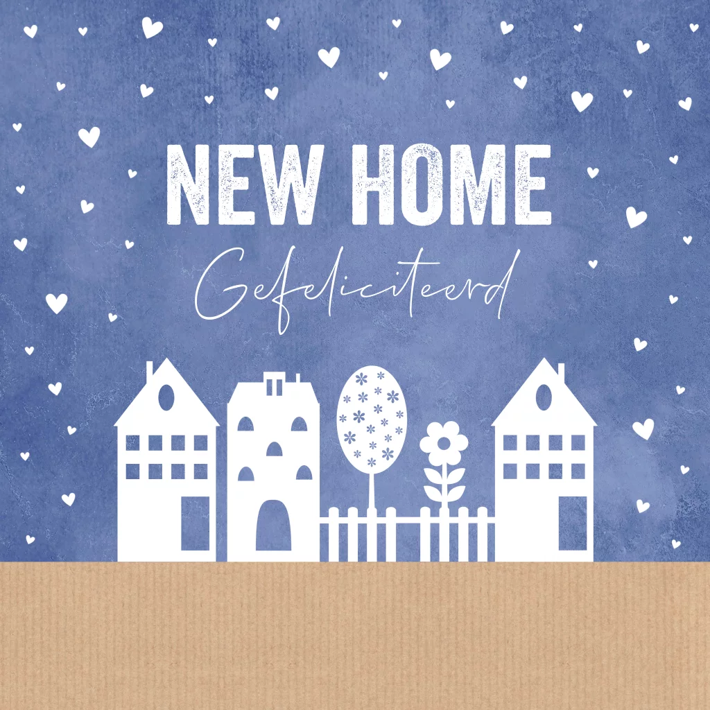 Felicitatie kaart nieuwe woning blauw met huisjes, kraftlook en hartjes.