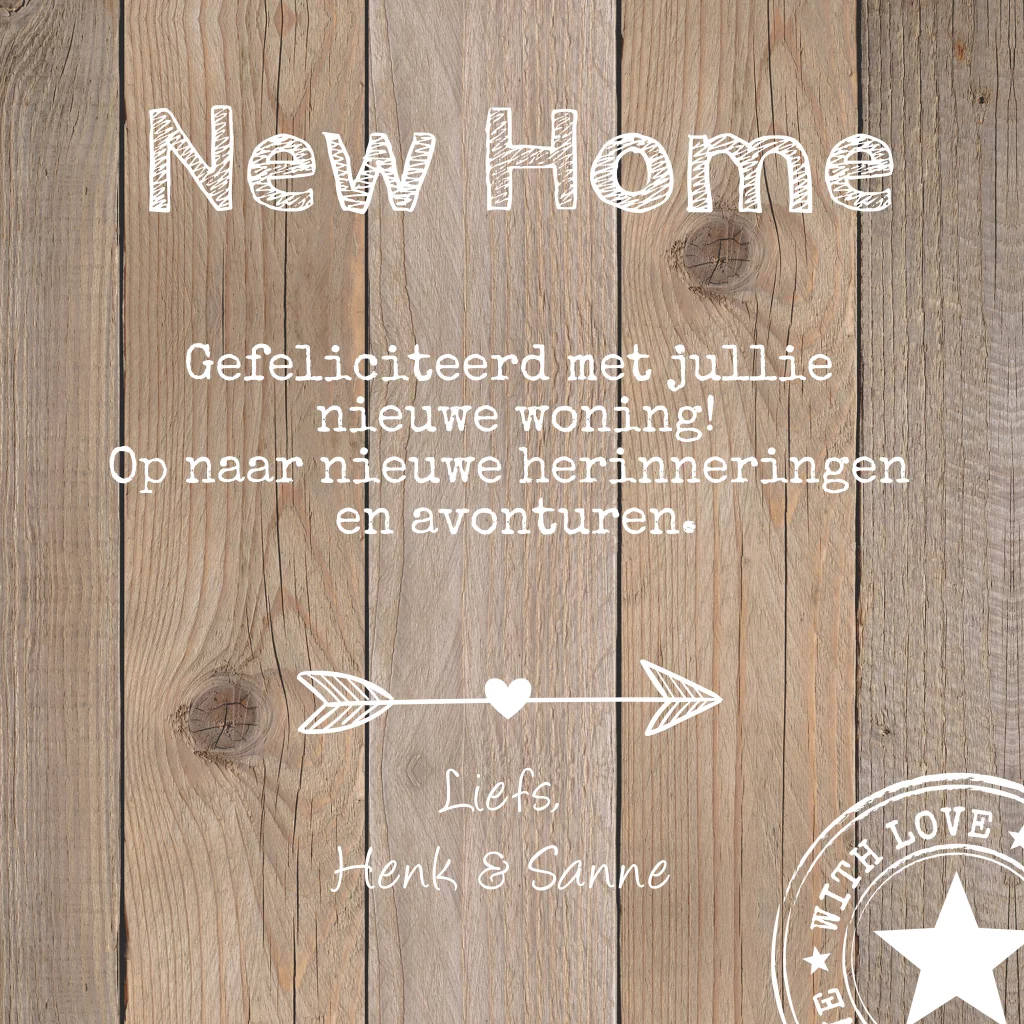 Felicitatiekaart nieuwe woning met label en houtprint.