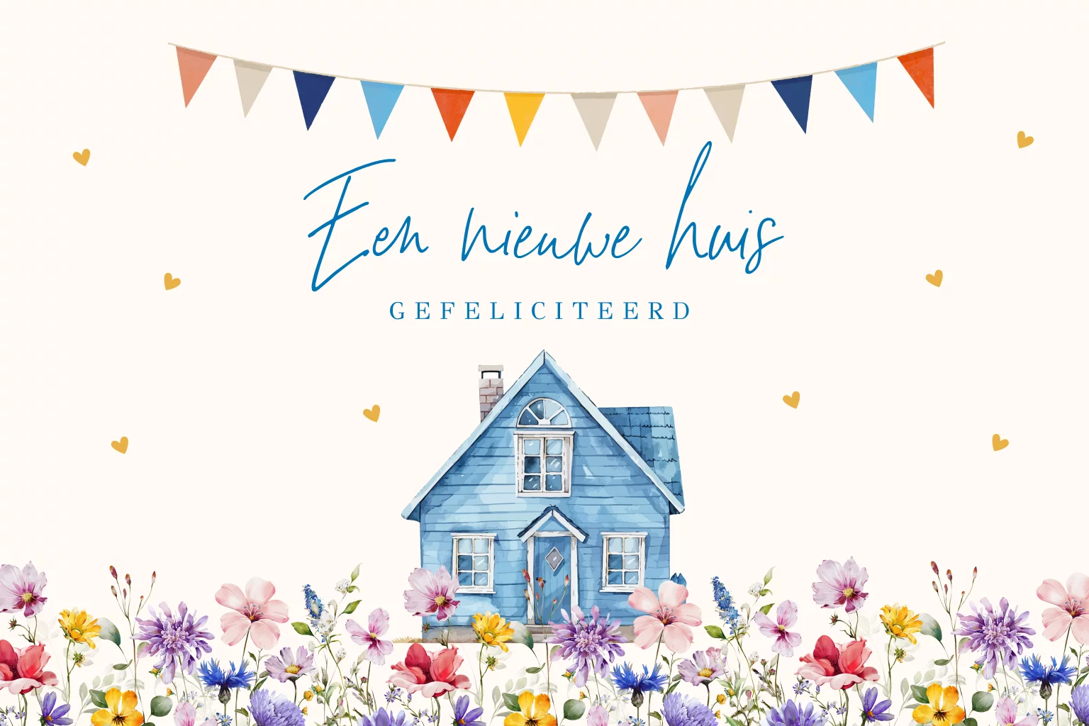 Felicitatie kaart nieuwe woning met huisje, slinger en bloemen.