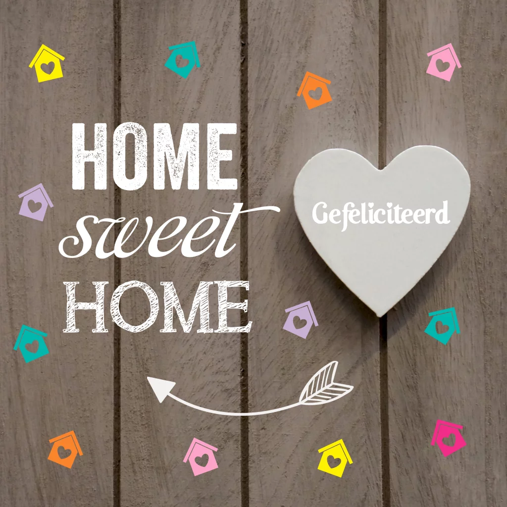 Felicitatie kaart nieuwe woning met houtlook, hartje en gekleurde huisjes.