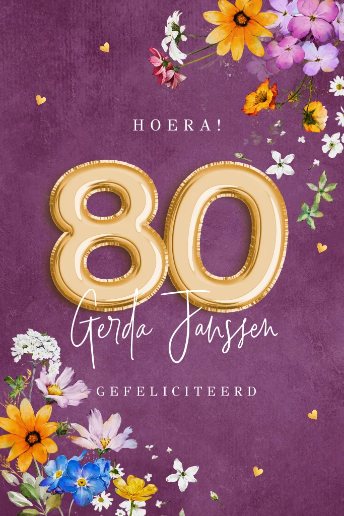 Verjaardagskaart 80 jaar ballonnen bloemen paars